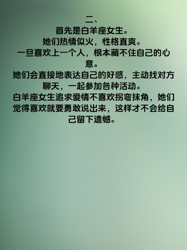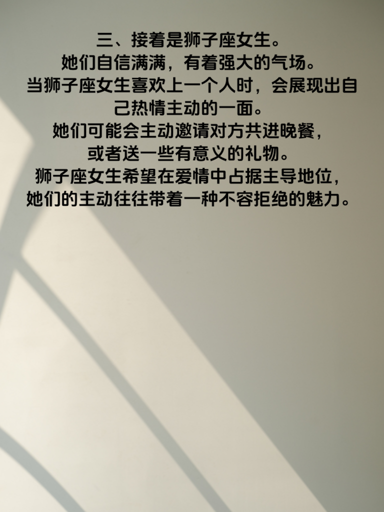一、在爱情的世界里,有些星座女倒追指数超高,她们一旦心动,就会主动出击。今天就来揭秘倒追指数最高的3大星座女。 二、首先是白羊座女生。她们热情似火,性格直爽。一旦喜欢上一个人,根本藏不住自己的心意。她们会直接地表达自己的好感,主动找对方聊天,一起参加各种活动。白羊座女生追求爱情不喜欢拐弯抹角,她们觉得喜欢就要勇敢说出来,这样才不会给自己留下遗憾。 三、接着是狮子座女生。她们自信满满,有着强大的气场。当狮子座女生喜欢上一个人时,会展现出自己热情主动的一面。她们可能会主动邀请对方共进晚餐,或者送一些有意义的礼物。狮子座女生希望在爱情中占据主导地位,她们的主动往往带着一种不容拒绝的魅力。 四、最后是射手座女生。她们热爱自由,追求新鲜感。在感情中,射手座女生如果遇到心仪的对象,也会主动展开追求。她们会和对方一起去探索新的地方,尝试新的事物。射手座女生的主动充满了活力与激情,能给对方带来不一样的恋爱体验。这三大星座女主动来擒,你遇到过吗?