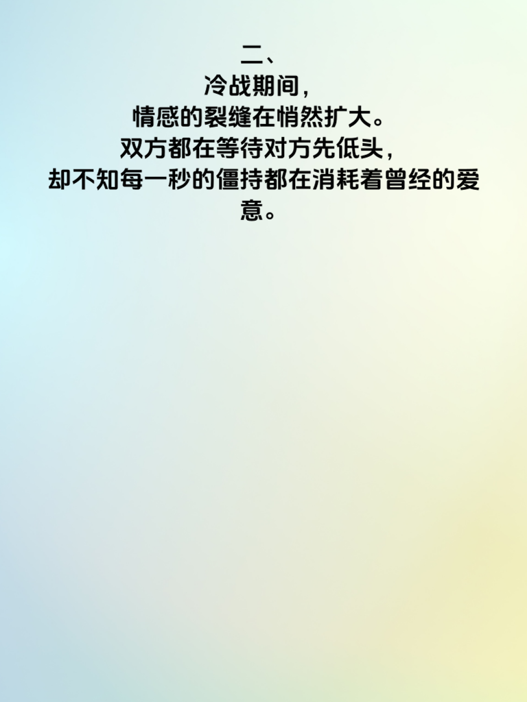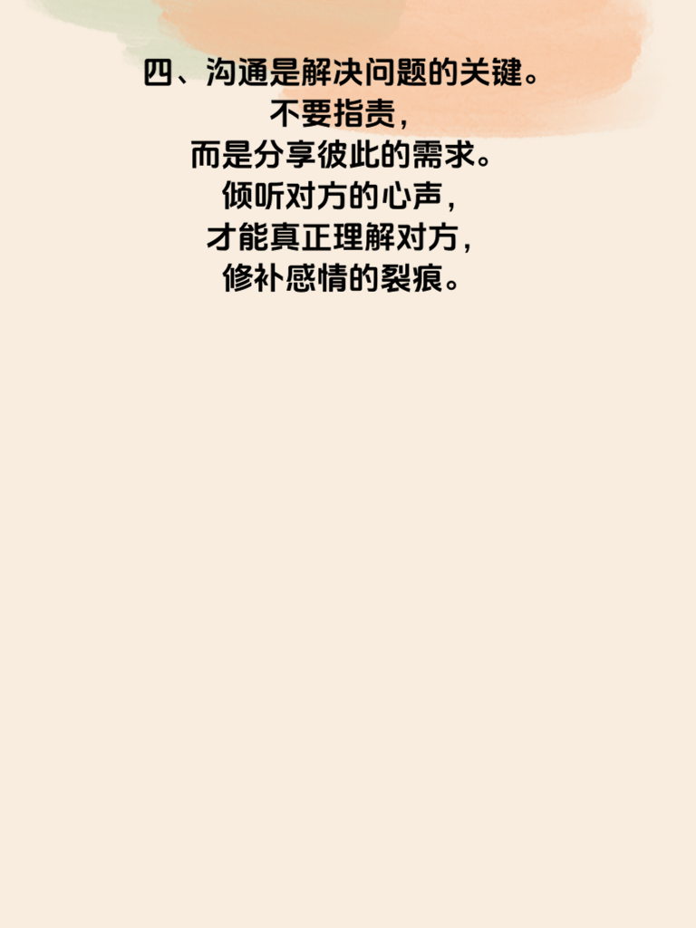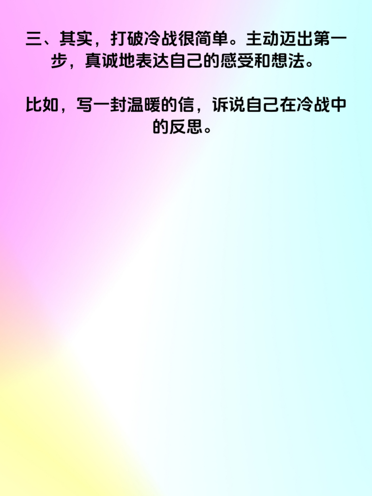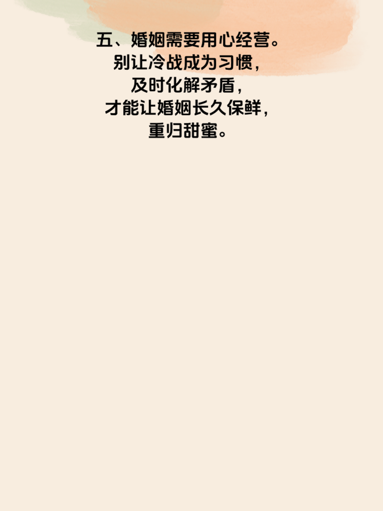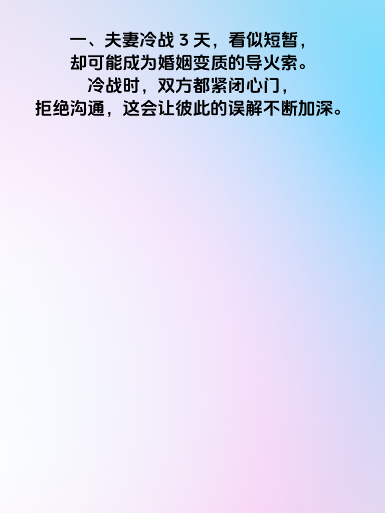 一、夫妻冷战3天,看似短暂,却可能成为婚姻变质的导火索。冷战时,双方都紧闭心门,拒绝沟通,这会让彼此的误解不断加深。 二、冷战期间,情感的裂缝在悄然扩大。双方都在等待对方先低头,却不知每一秒的僵持都在消耗着曾经的爱意。 三、其实,打破冷战很简单。主动迈出第一步,真诚地表达自己的感受和想法。比如,写一封温暖的信,诉说自己在冷战中的反思。 四、沟通是解决问题的关键。不要指责,而是分享彼此的需求。倾听对方的心声,才能真正理解对方,修补感情的裂痕。 五、婚姻需要用心经营。别让冷战成为习惯,及时化解矛盾,才能让婚姻长久保鲜,重归甜蜜。