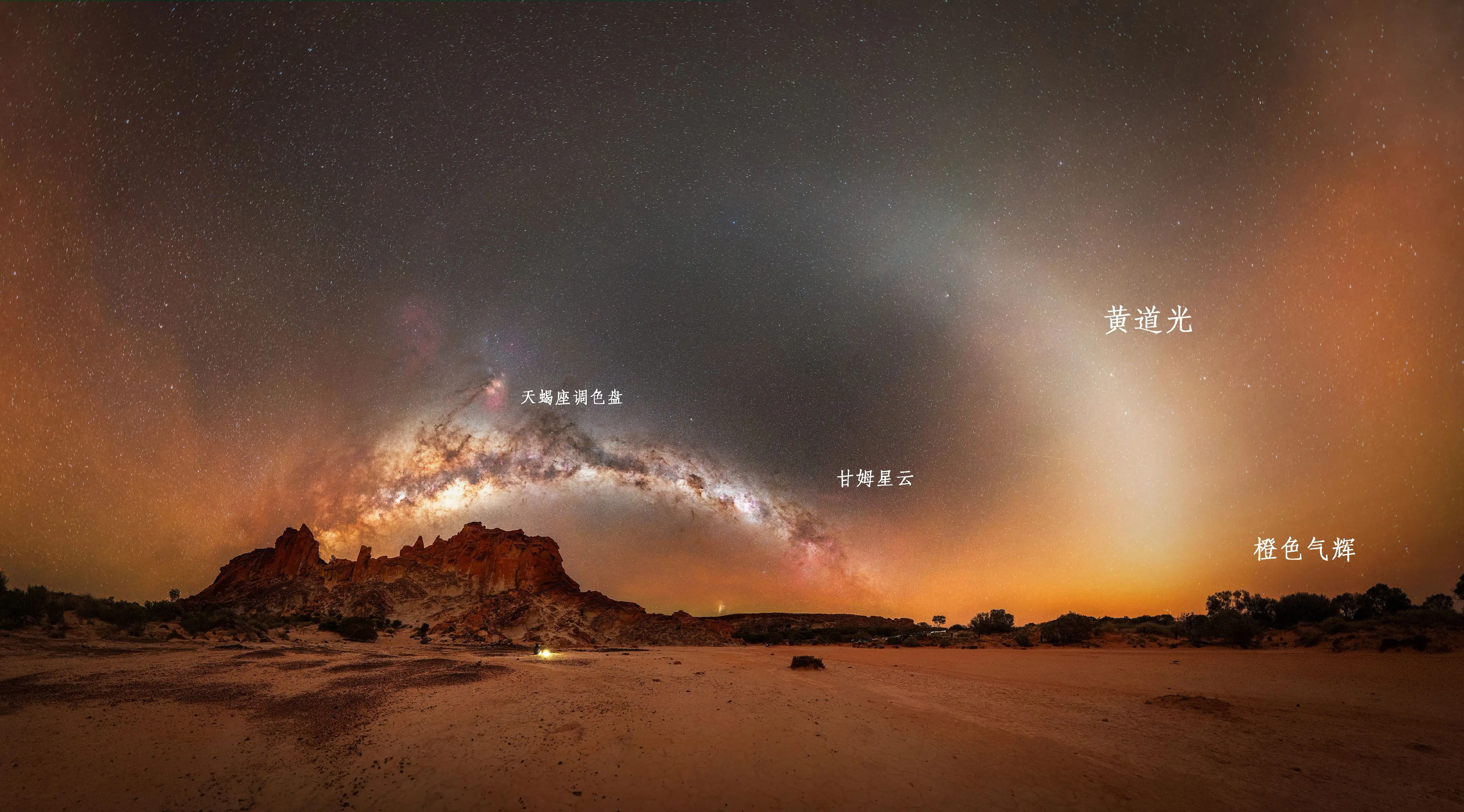 银河拱桥看腻了来看看黄道拱吧。彩虹谷位于澳大利亚北领地荒原的深处,它的色彩来自数百万年来风化、侵蚀和矿物沉积,不同颜色的砂岩让他如同沉睡在大地上的彩虹。 由于地理位置偏僻造就了这里完美的暗夜环境。 夜晚银心汇成的拱桥与由太阳系尘埃反射阳光形成的黄道光并肩而立。两道“光之虹”与彩虹谷同时在这片古老的红土之上静静绽放。