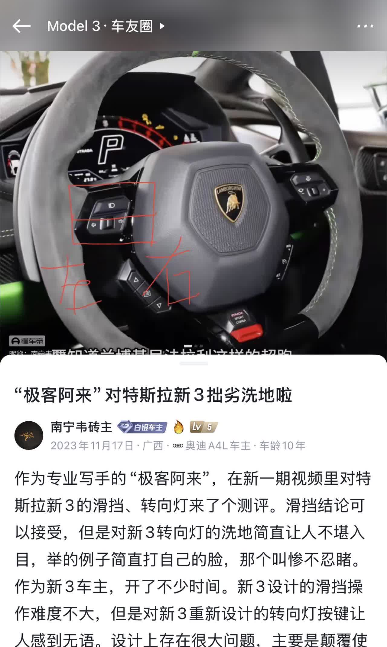 终于, 特斯拉新3终于加回变道拔杆。 从23年11月至今25年8月, 时间已经过去了将近两年。 在车主千呼万换中特斯拉变道杆回归了, 这是市场竞争激烈下的结果。 当然, 也是特斯拉尊重车主的妥协产物。 不管么说, 对于车主而言是非常好的事情。 作为新3车主, 苦小按键久矣。 一开始就不看好这个设计, 不管自媒体怎么说。 事实证明不好用就是不好用, 厂家承认改了就好。 如果说了一个谎言要用更多的谎言去掩盖, 显然这是不符合市场规律的。 从懂车帝发布信息2499元来看, 希望这个价格可以下调到千元以内, 如此更容易获得车主的认可。【来自懂车帝车友圈】
