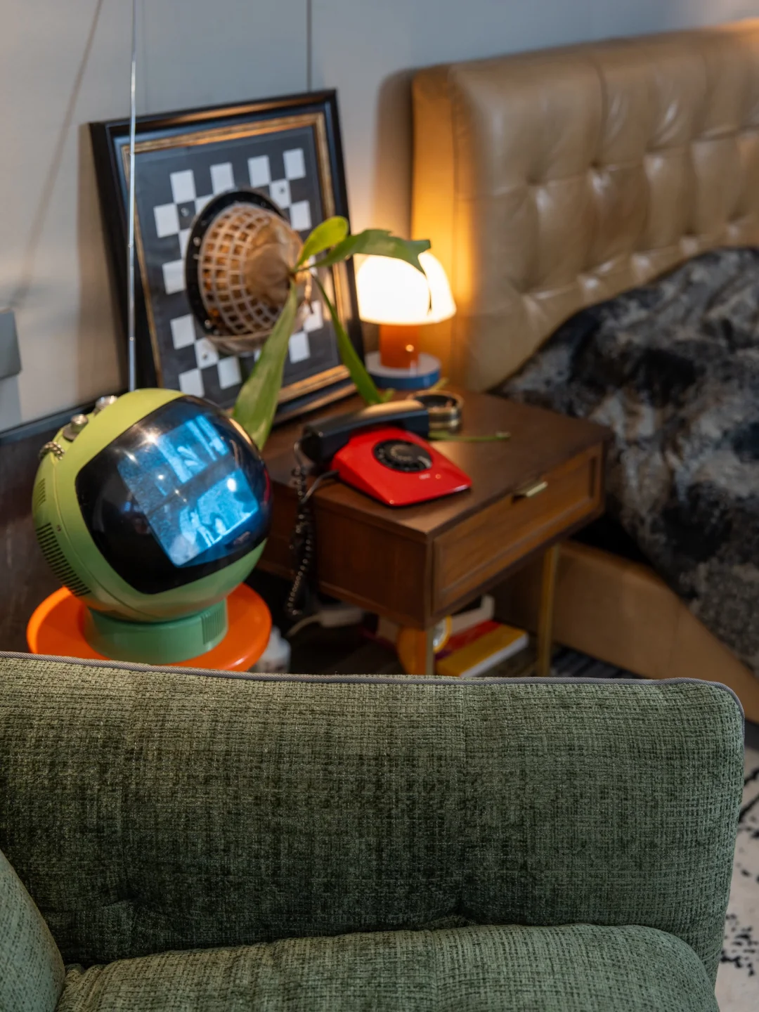 转着圈摸复古球形电视、够红色座机假装打电话📞