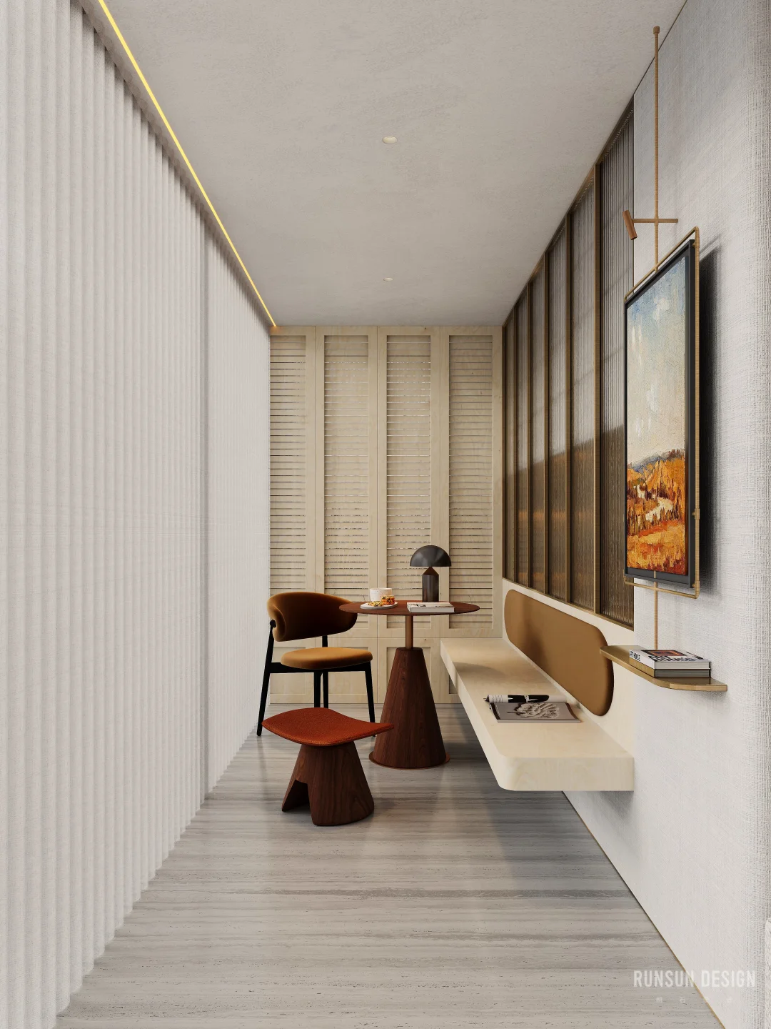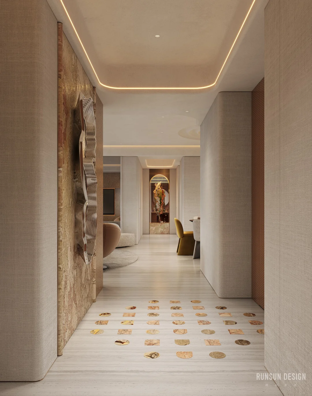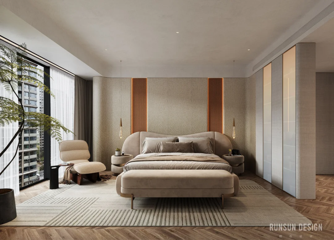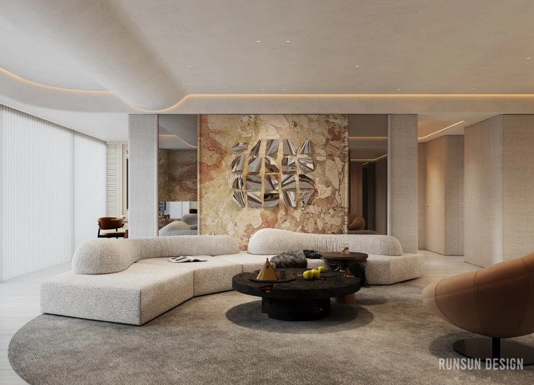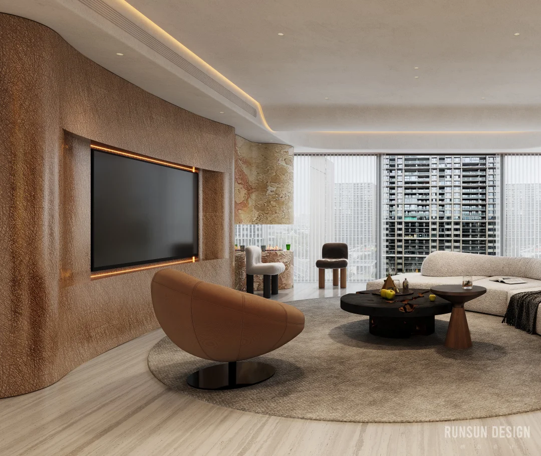 新案.天樾玺私宅 “ 设计概念 ” 以“大地”为母题, 以“诗韵”为笔法, 共同书写这首名为“家”的立体诗。 从踏出电梯的那一刻便开始书写, 自然纹理材质如同地质学家精心标注的地层剖面, 揭示着时间的力量与历史的层叠......