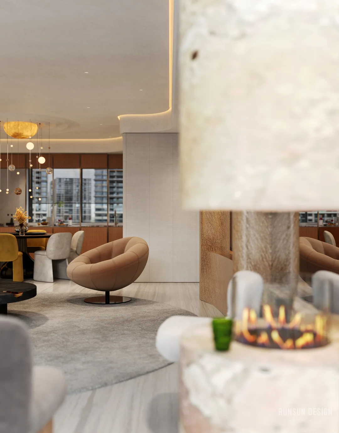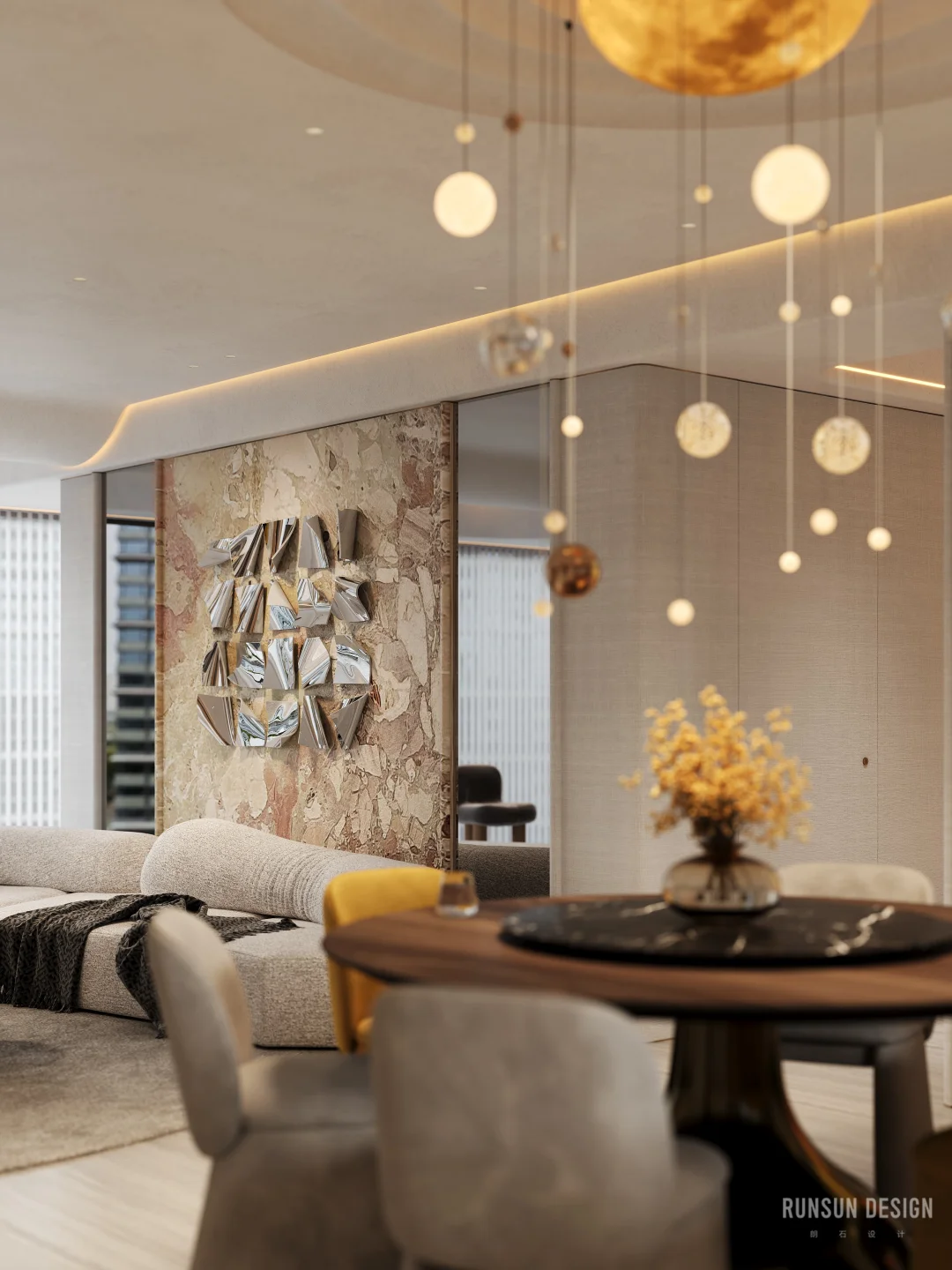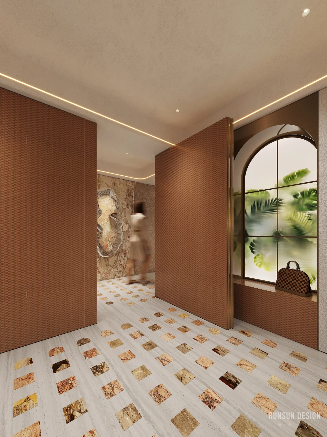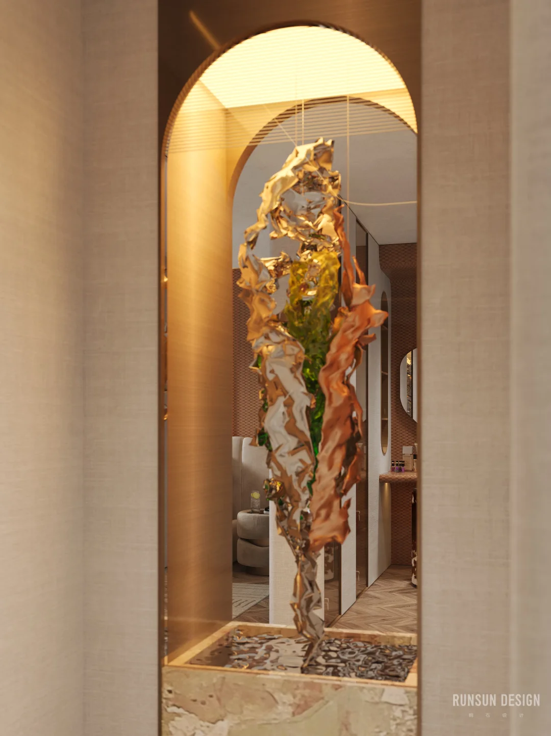 新案.天樾玺私宅 “ 设计概念 ” 以“大地”为母题, 以“诗韵”为笔法, 共同书写这首名为“家”的立体诗。 从踏出电梯的那一刻便开始书写, 自然纹理材质如同地质学家精心标注的地层剖面, 揭示着时间的力量与历史的层叠......
