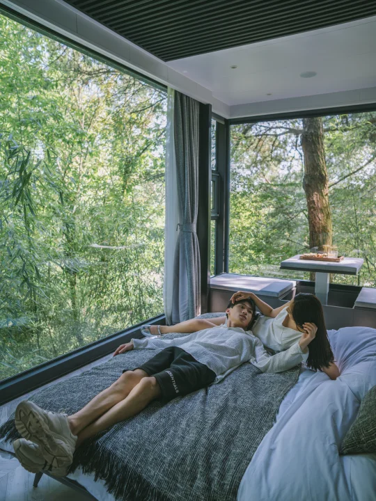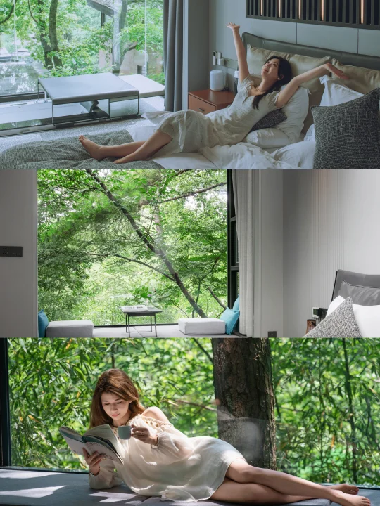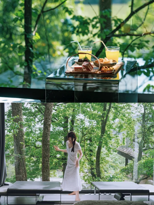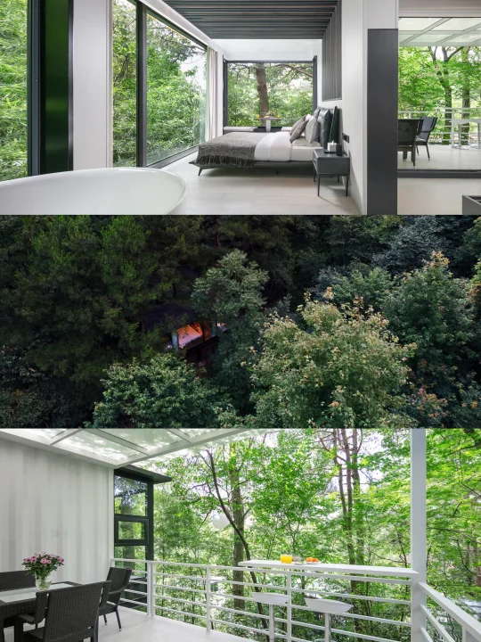 谁懂啊!在700米山巅的玻璃树屋里醒来,推开门就是云雾缭绕的竹林云海,傍晚在草坪上享用浪漫烛光晚餐,抬头就是漫天星星 ✨这才是江浙沪度假的正确打开方式啊! · 🏡住进森林里的玻璃树屋 ▪️ 270°全景落地窗,中国美院设计的神仙树屋,黑钢线条+全景落地窗,阳光透过松针洒进来,光影斑驳得像走进《爱丽丝梦游仙境》📸随便拍都是杂志大片!