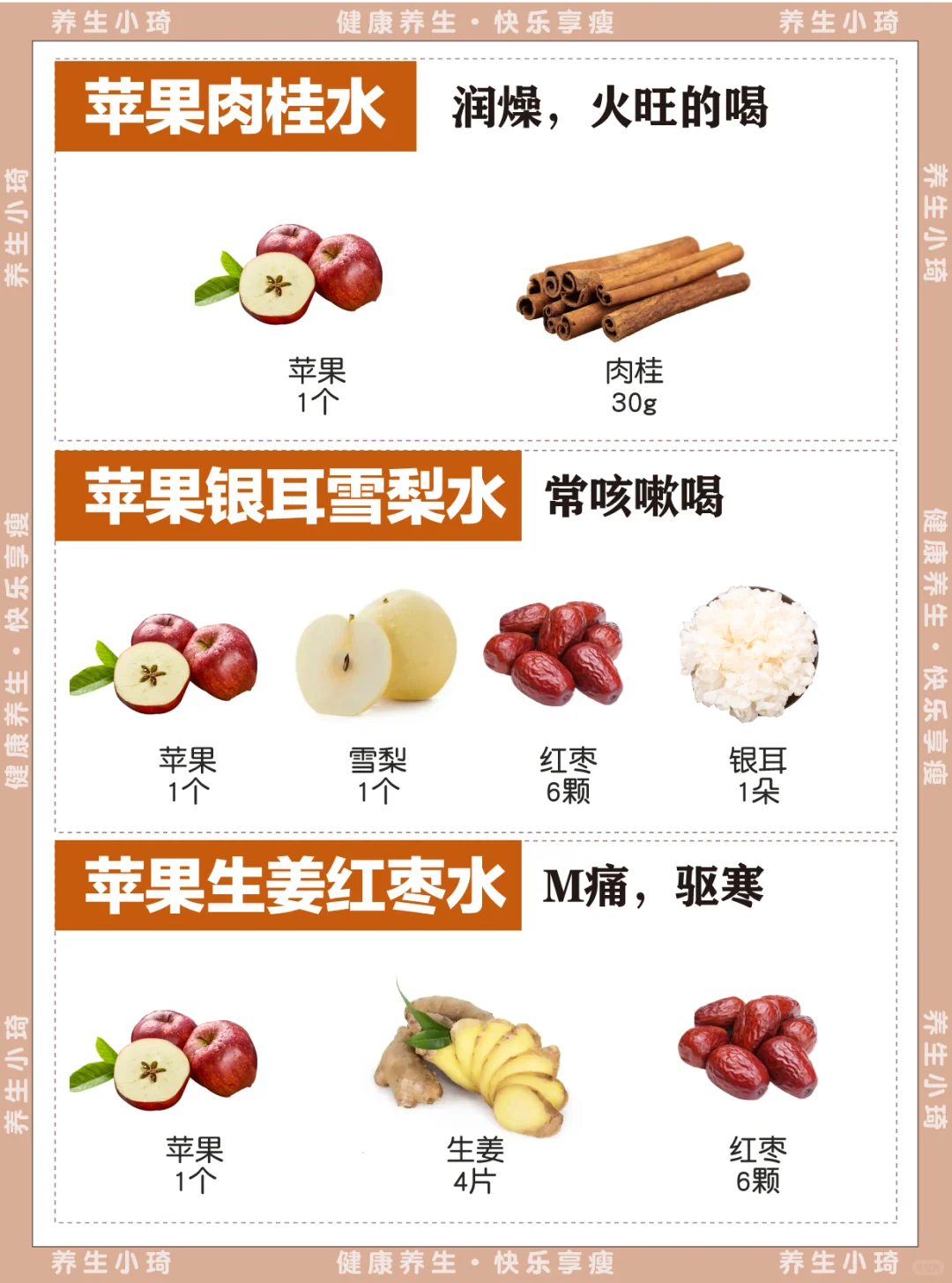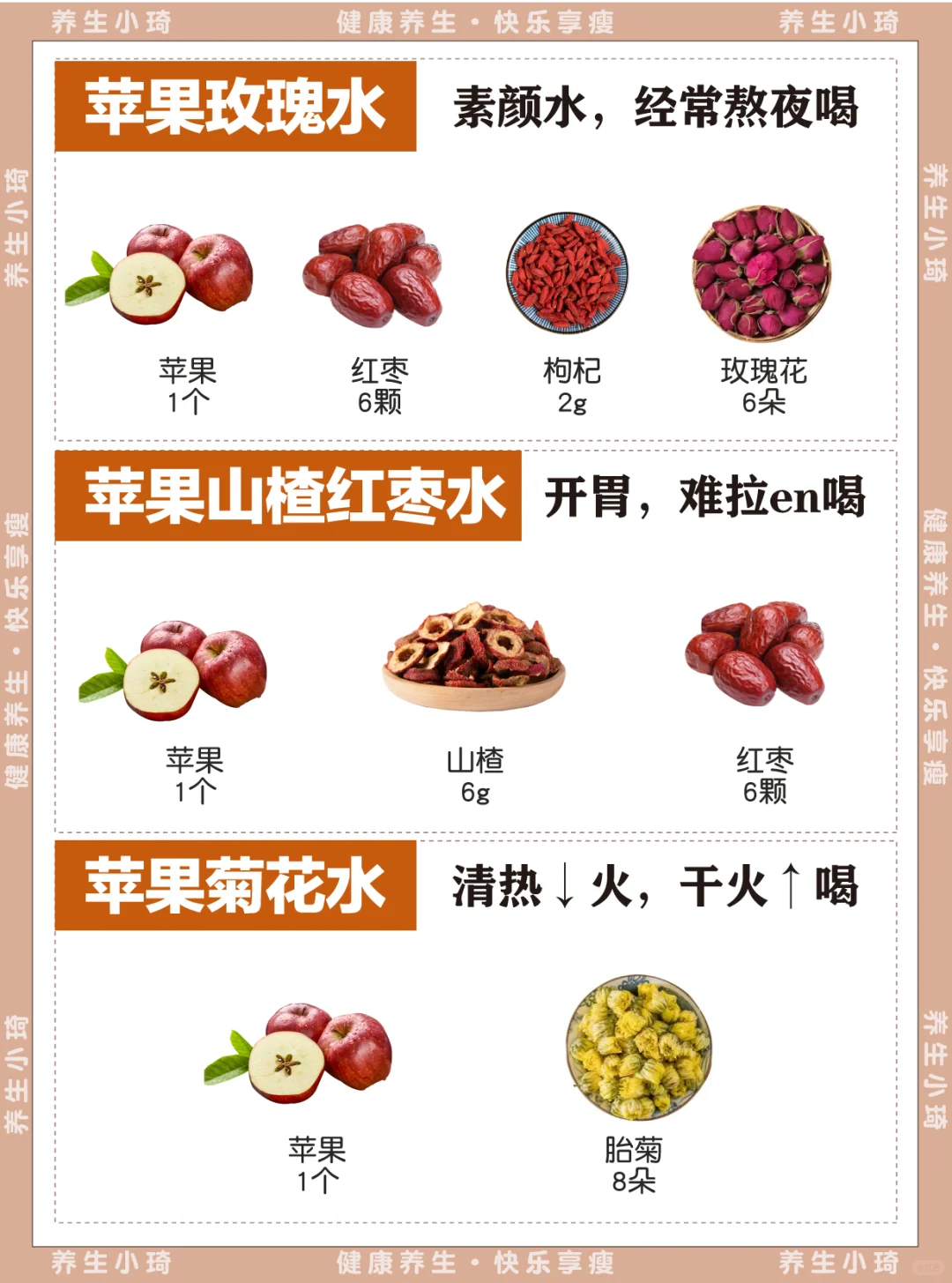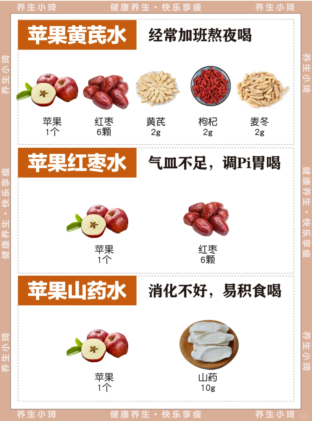 正所谓“一天一苹果,YI🧑⚕️生远离我” 苹果水的好处,99%的人都不知道 今天给大家分享一些苹果煮水的方法,赶紧mark 🍎熬夜加班水:苹果黄芪水 🍎脸色红红:苹果红枣水 🍎消化不好:苹果山药水 🍎久坐肚子大:苹果肉桂水 🍎经常keke:苹果银耳雪梨水 🍎每个月容易痛痛:苹果生姜红枣水 🍎素颜加班水:苹果玫瑰水 🍎enen难水:苹果山楂红枣水 🍎干火↑水:苹果菊花水 - 每天一杯,养生又养颜,真的不要太适合春天! 赶紧安排起来吧~