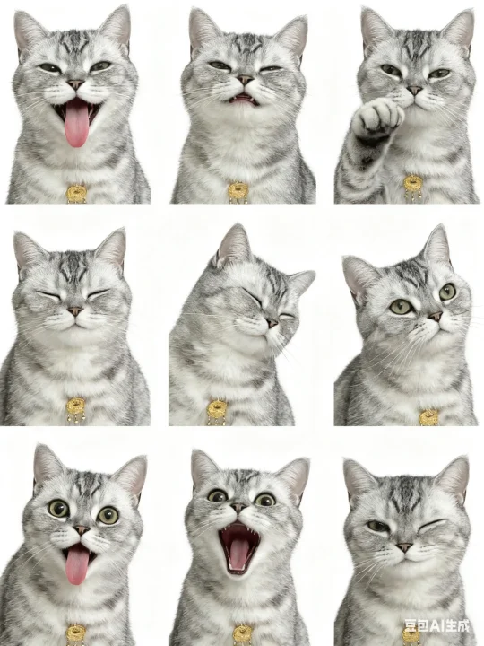 帮我生成图片:帮我生成图片:这张图片以纯白色为背景,采用九宫格排 版,展示了一只宠物的九种不同表情。第 一排从左到右,宠物先是吐着舌头,露出 开心的模样,接着嘴巴微张,似在温和表达,然后一只爪子靠近脸部,神情略显晒。第二排,宠物先保持着平静的神态,随后双眼眯起,仿佛在惬意微笑,之后脑 袋微侧,露出好奇的样子。第三排,宠物 先是睁大眼睛,吐舌是现出活泼的状态,接着张大嘴巴将宠物的“小情绪”细腻展现,以后睁一只眼wink