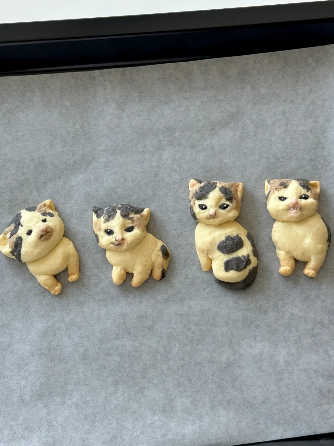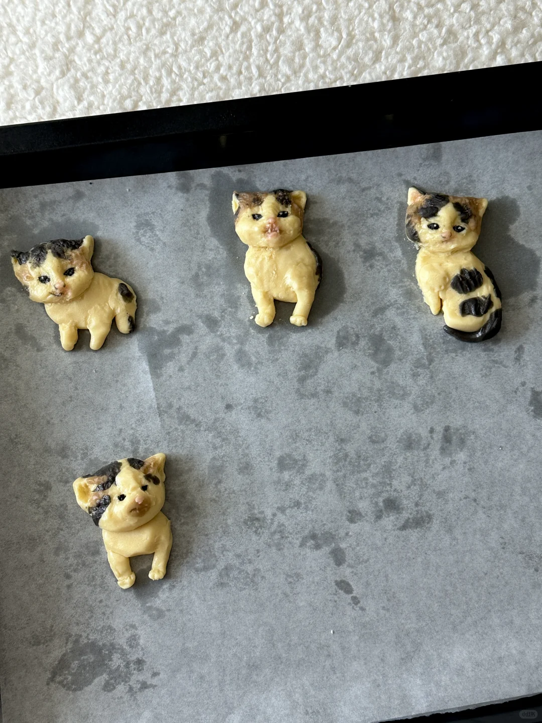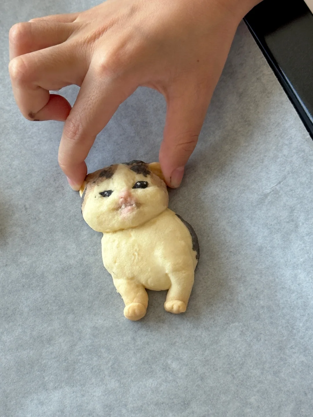 奶香香的可爱邪恶小猫~ 所需材料: 黄油50g,糖粉 25g,盐1g,低筋面粉 85g,常温全蛋液13g左右 制作步骤: 1️⃣室温软化黄油 2️⃣加入糖粉,盐,混合均匀 3️⃣加入低筋面粉翻拌均匀,再少量多次加入蛋液,可揉成软软的面团即可 4️⃣面团分块上色(棕色:可可粉 黑色:竹炭粉 粉色:仙人掌果粉 5️⃣有耐心的捏出形状,捏好后冰箱冷藏 6️⃣烤箱预热,150°烤20 分钟左右