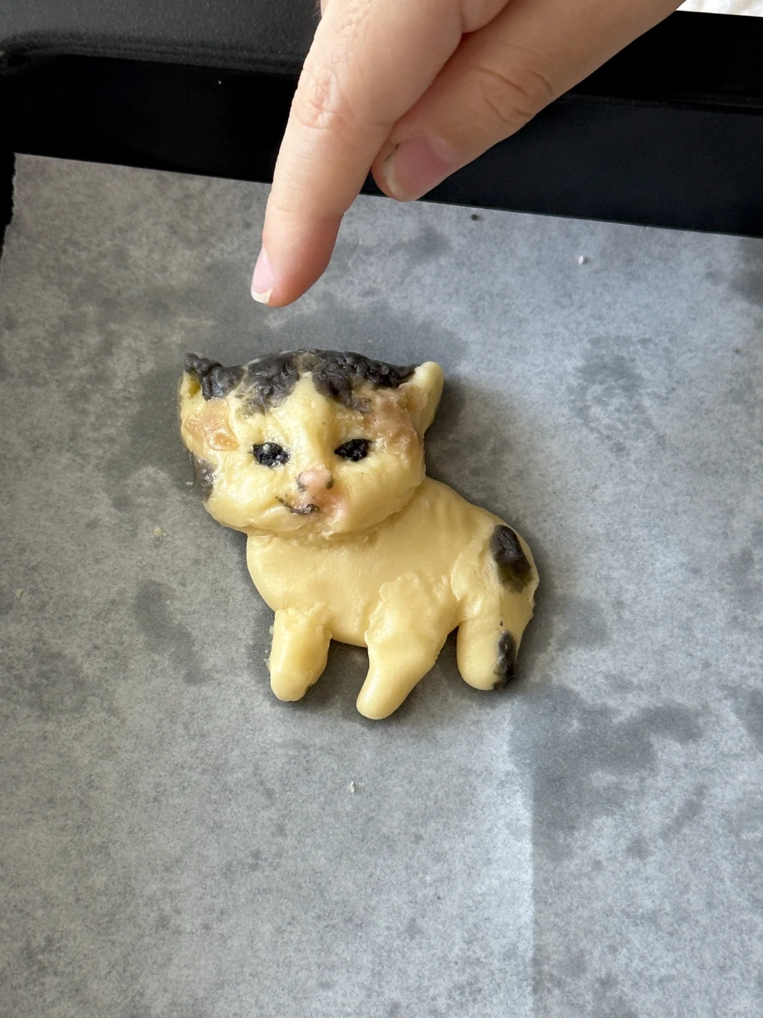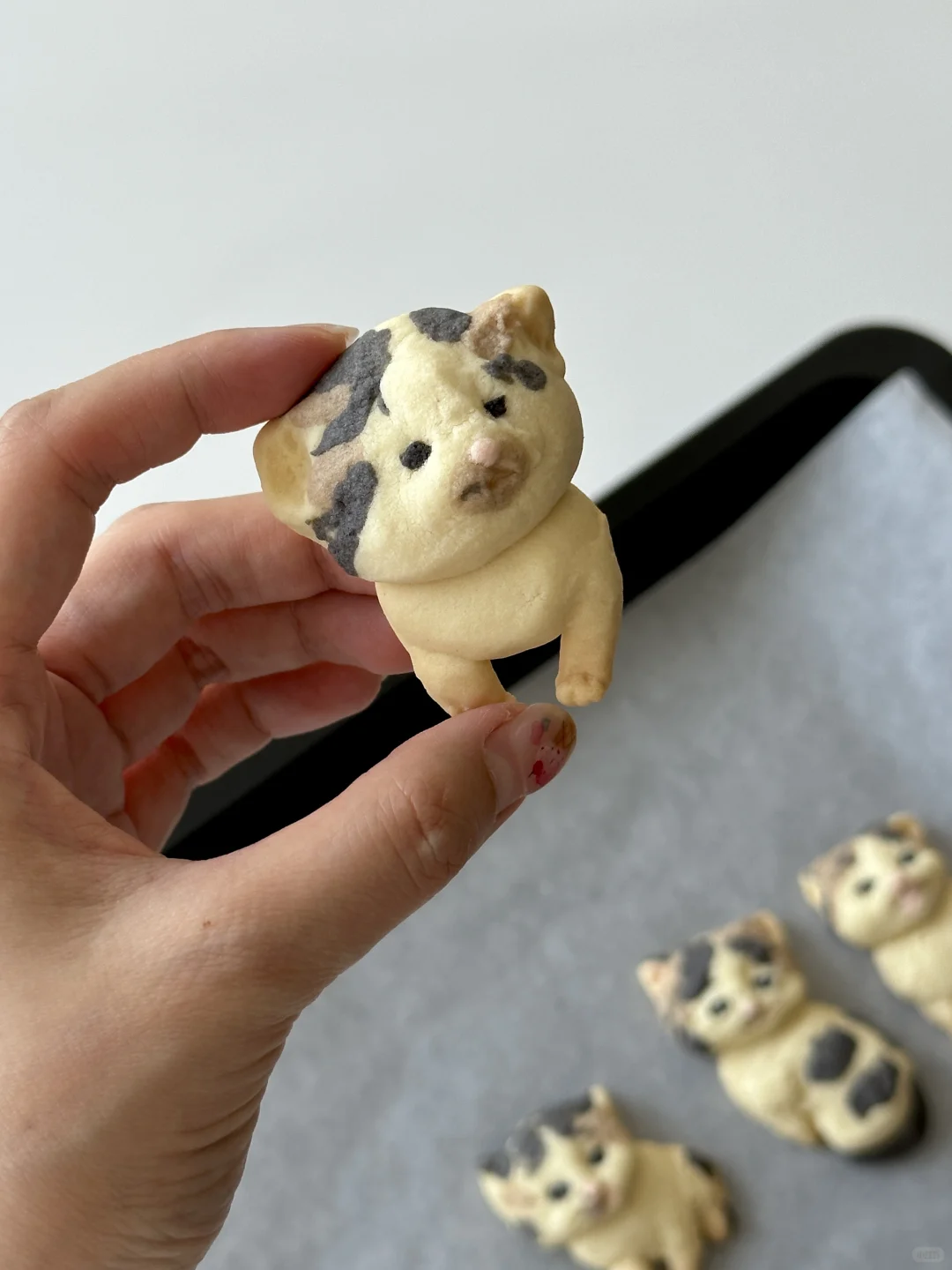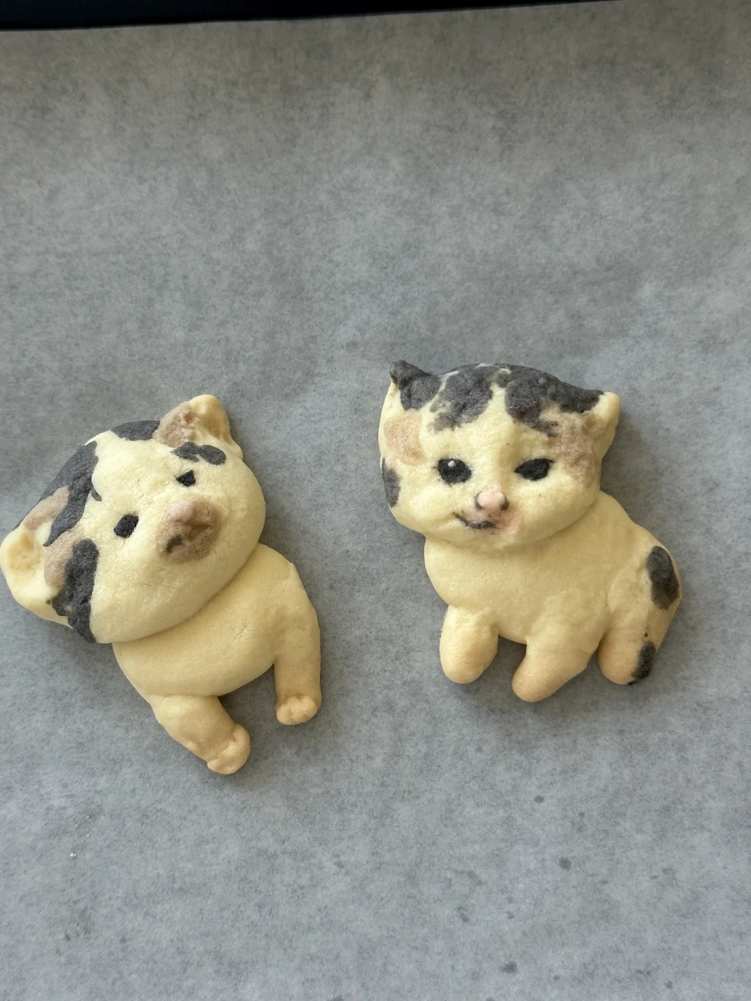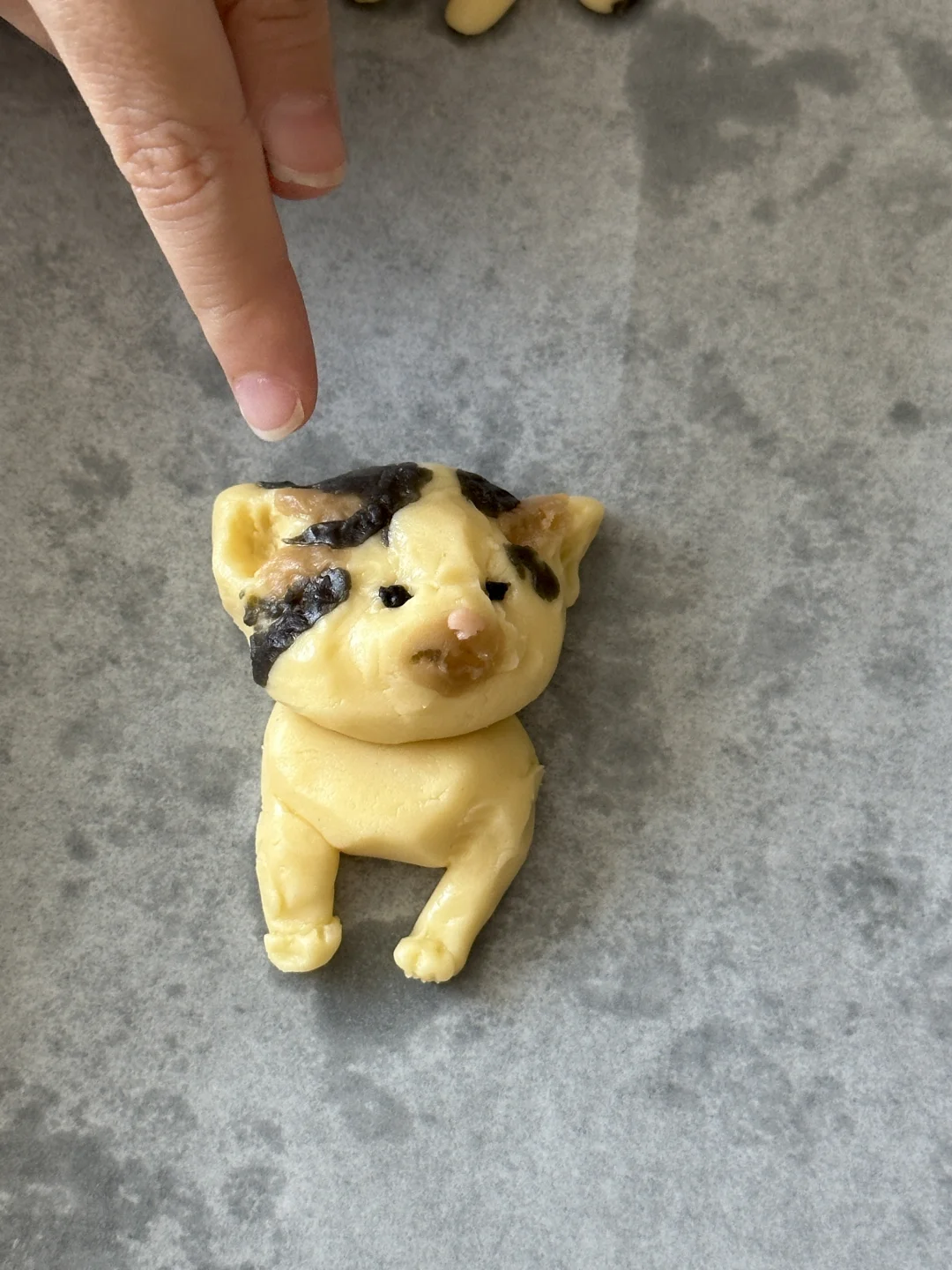 奶香香的可爱邪恶小猫~ 所需材料: 黄油50g,糖粉 25g,盐1g,低筋面粉 85g,常温全蛋液13g左右 制作步骤: 1️⃣室温软化黄油 2️⃣加入糖粉,盐,混合均匀 3️⃣加入低筋面粉翻拌均匀,再少量多次加入蛋液,可揉成软软的面团即可 4️⃣面团分块上色(棕色:可可粉 黑色:竹炭粉 粉色:仙人掌果粉 5️⃣有耐心的捏出形状,捏好后冰箱冷藏 6️⃣烤箱预热,150°烤20 分钟左右