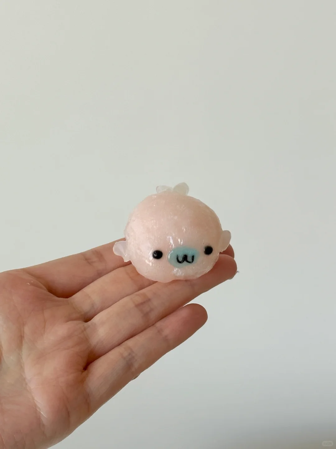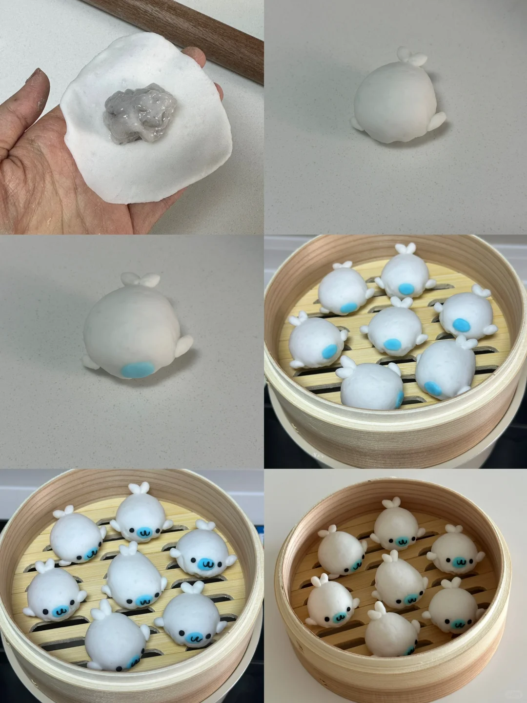 真的可以一口一小只~ [萌萌哒R]所需材料:皮面:澄粉45g,士豆淀粉 15g, 58g 开水 制作步骤: 1️⃣澄粉士豆淀粉加开水筷子搅拌成絮状,揉成光滑面团,切分每个面团大概15g左右~ 2️⃣擀薄,包包子手法包好,剩余面团蓝色色素,竹炭粉上色 3️⃣装饰细节部分(涂一点点水更好粘合哦)这一步要有耐心 4️⃣水开上锅蒸七分钟,焖2分钟即可 快来交作业吧![飞吻R]