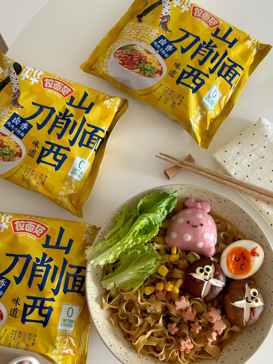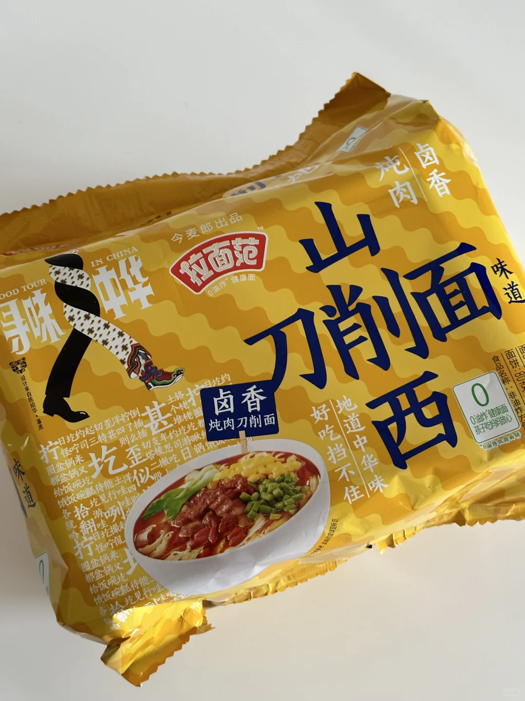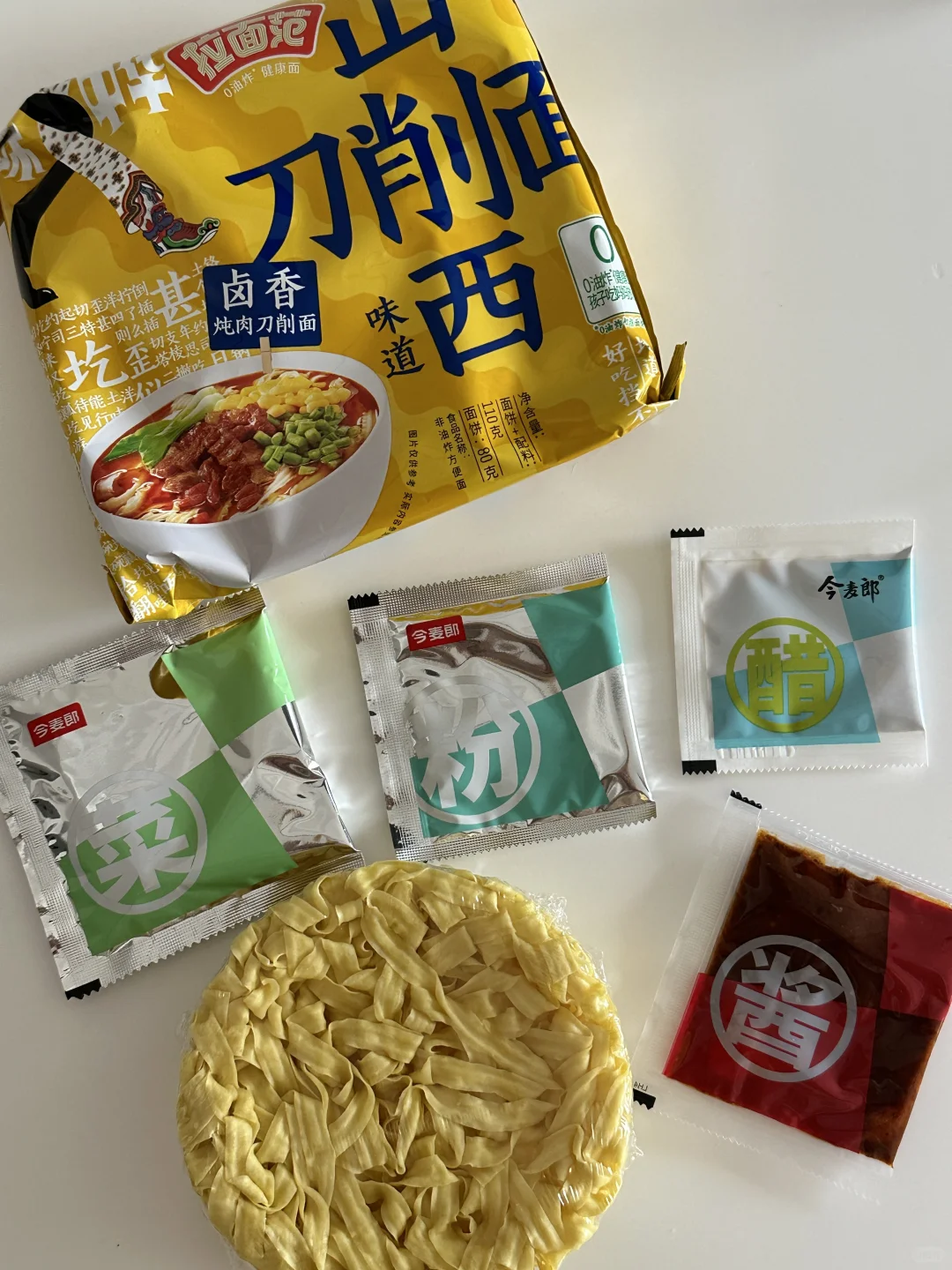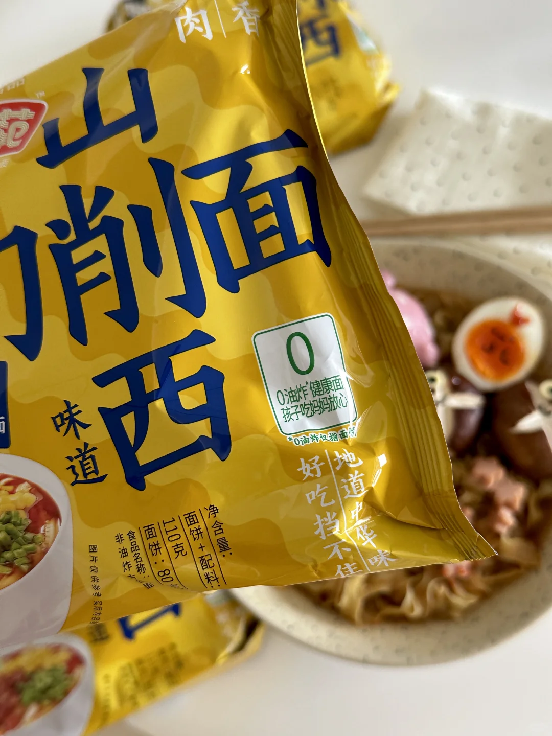 这次我用到的是拉面范山西刀削面哦~浓浓的卤香炖肉味儿,0️⃣油炸面饼,健康放心,做给家里宝贝吃,妈妈也很安心!口感外滑内筋的浪花面,越嚼越香耶~而且菜包很丰富,量也很足,搭配浓郁酸香的山西陈醋包,一口下去,香掉眉毛!