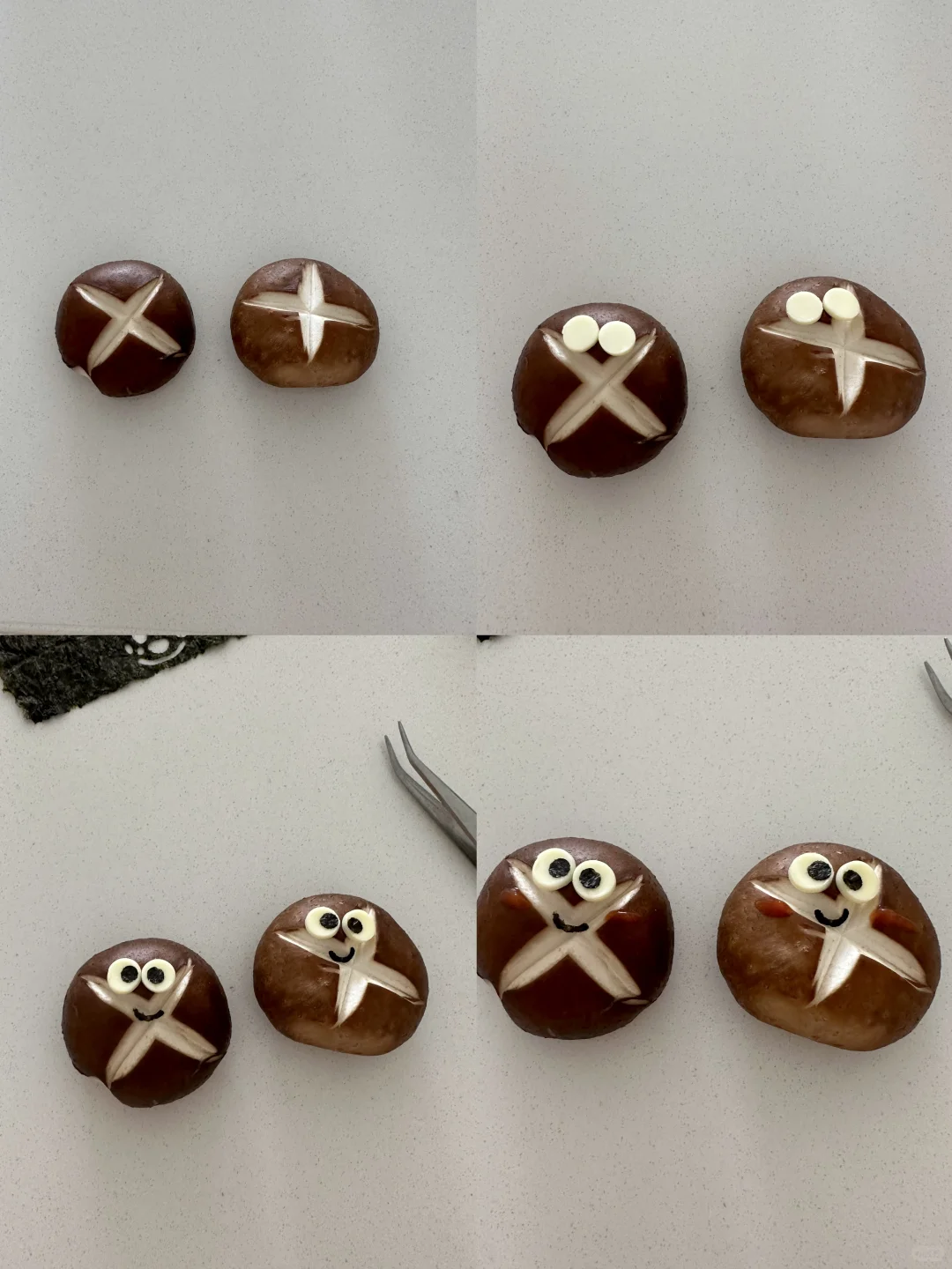 做一个可爱的福袋年糕,把溏心蛋做成可爱的角落生物炸虾,两个香菇用芝士片,海苔装饰上可爱的表情,番茄酱做腮红哦~[萌萌哒R]