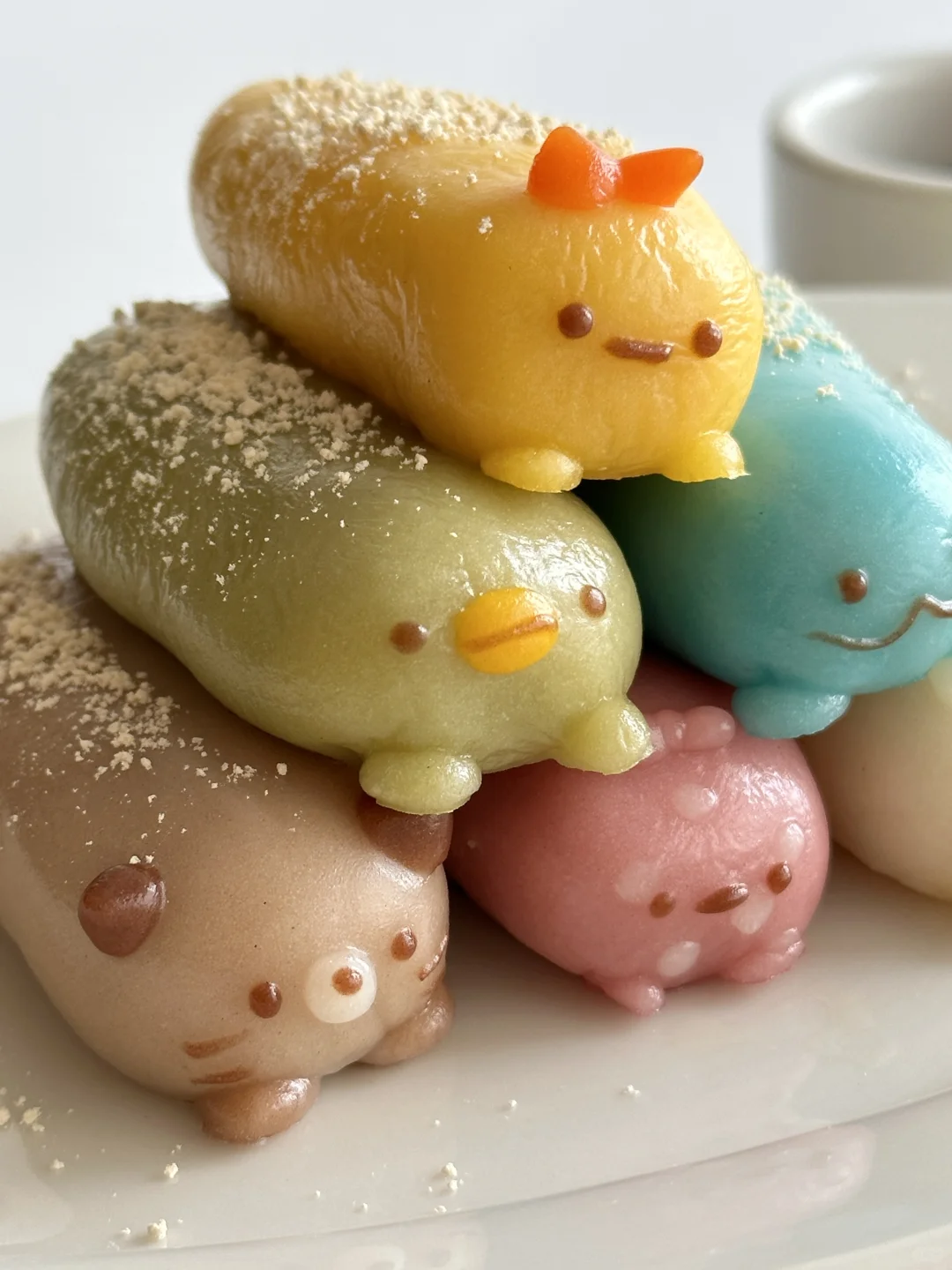 绿色:抹茶粉 黄色:南瓜粉 粉色:仙人掌果粉 蓝色:蓝色色素或蝶豆花粉 棕色:可可粉 橙色:黄金芝士粉