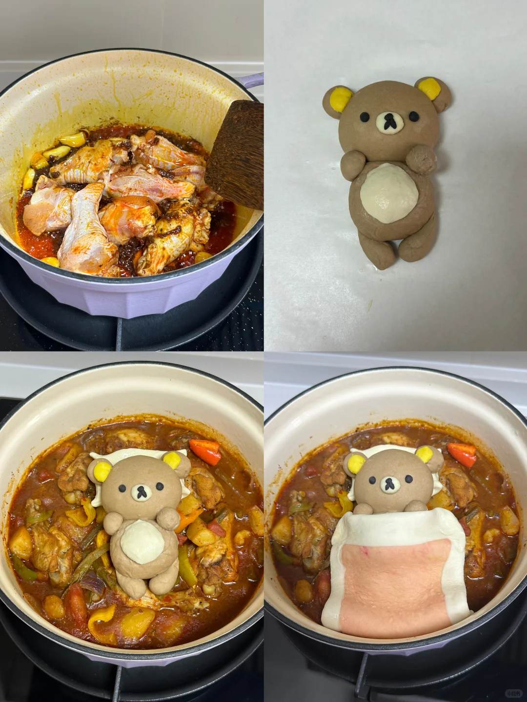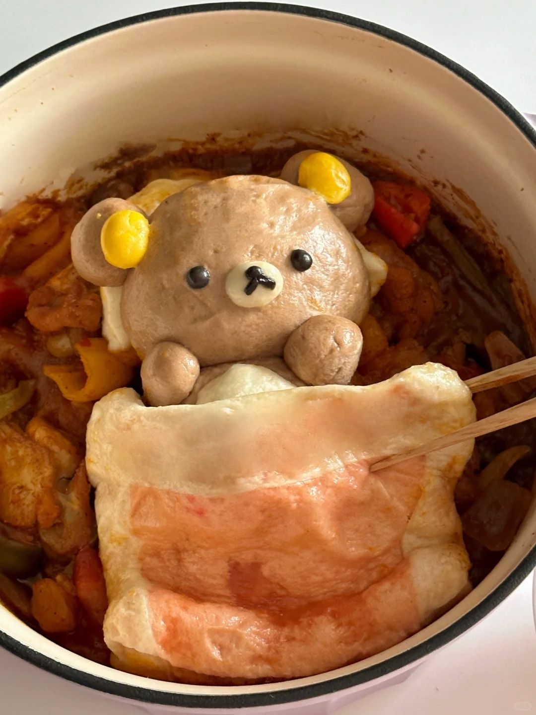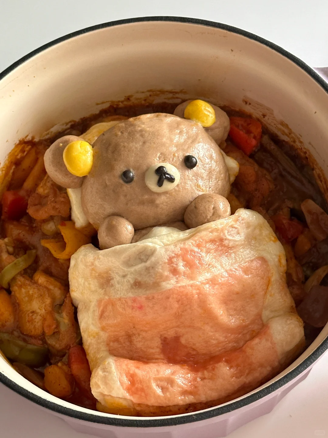 6️⃣锅中下入彩椒,洋葱,将熊熊放在锅中盖上被子,中火焖煮15分钟便可出锅啦~