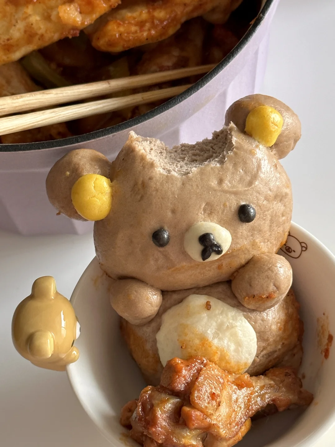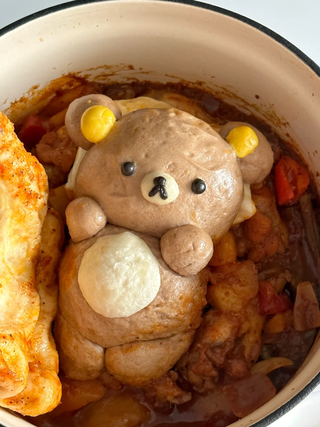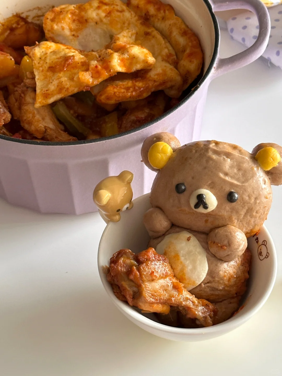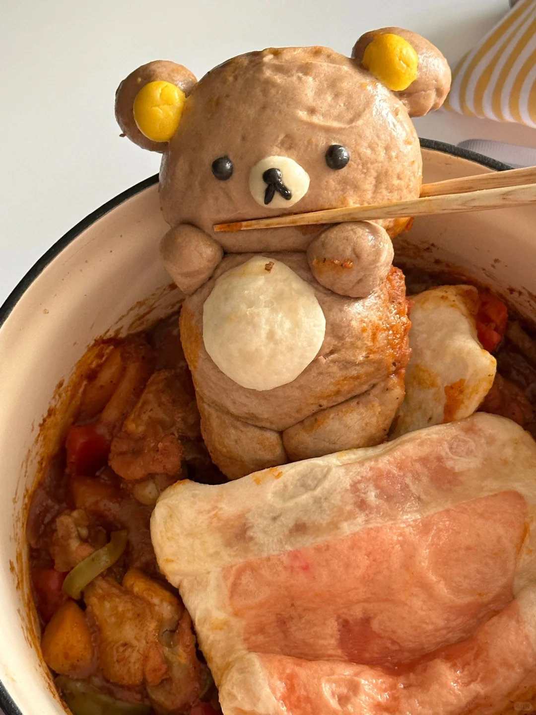 6️⃣锅中下入彩椒,洋葱,将熊熊放在锅中盖上被子,中火焖煮15分钟便可出锅啦~