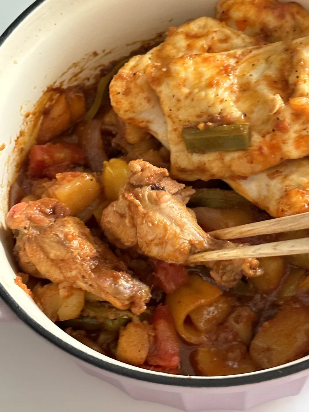 葱段,姜片,大蒜,洋葱,郫县豆瓣酱,胡萝卜,土豆,彩椒,玉米,小鸡腿,八角两颗,花椒粉,十三香