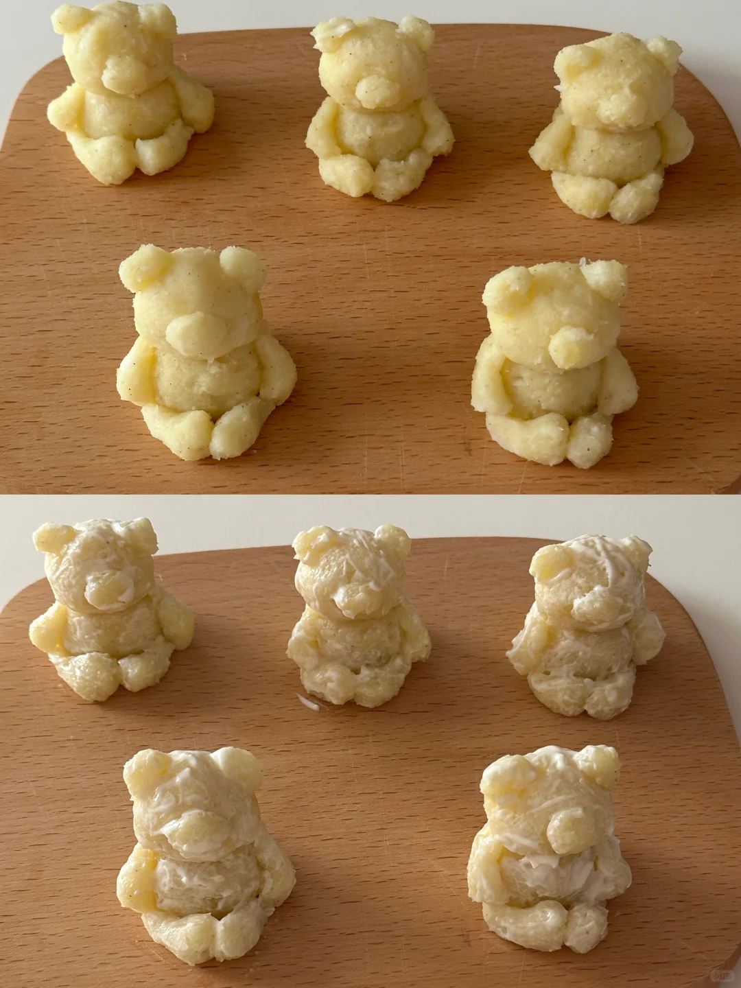 6️⃣土豆切块蒸熟,碾成泥,加入黑椒海盐,擦一些干酪碎,捏出巴塞罗熊样子,用刷子给小熊均匀的刷上沙拉酱,撒上肉松,巧克力笔画出鼻子眼睛~