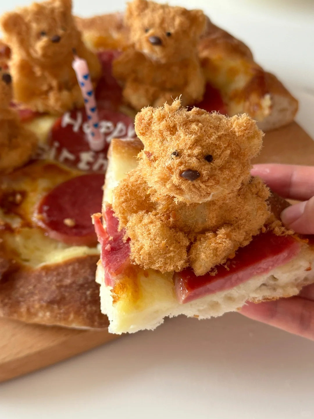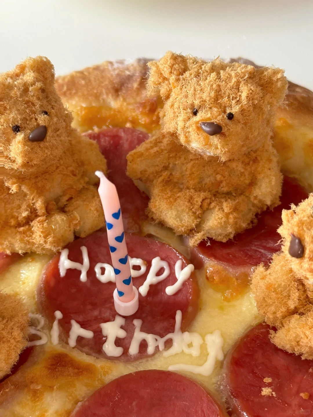 7️⃣出炉的披萨摆放上做好的肉松土豆泥小熊,沙拉酱装在裱花袋剪小口口,写出happybirthday~