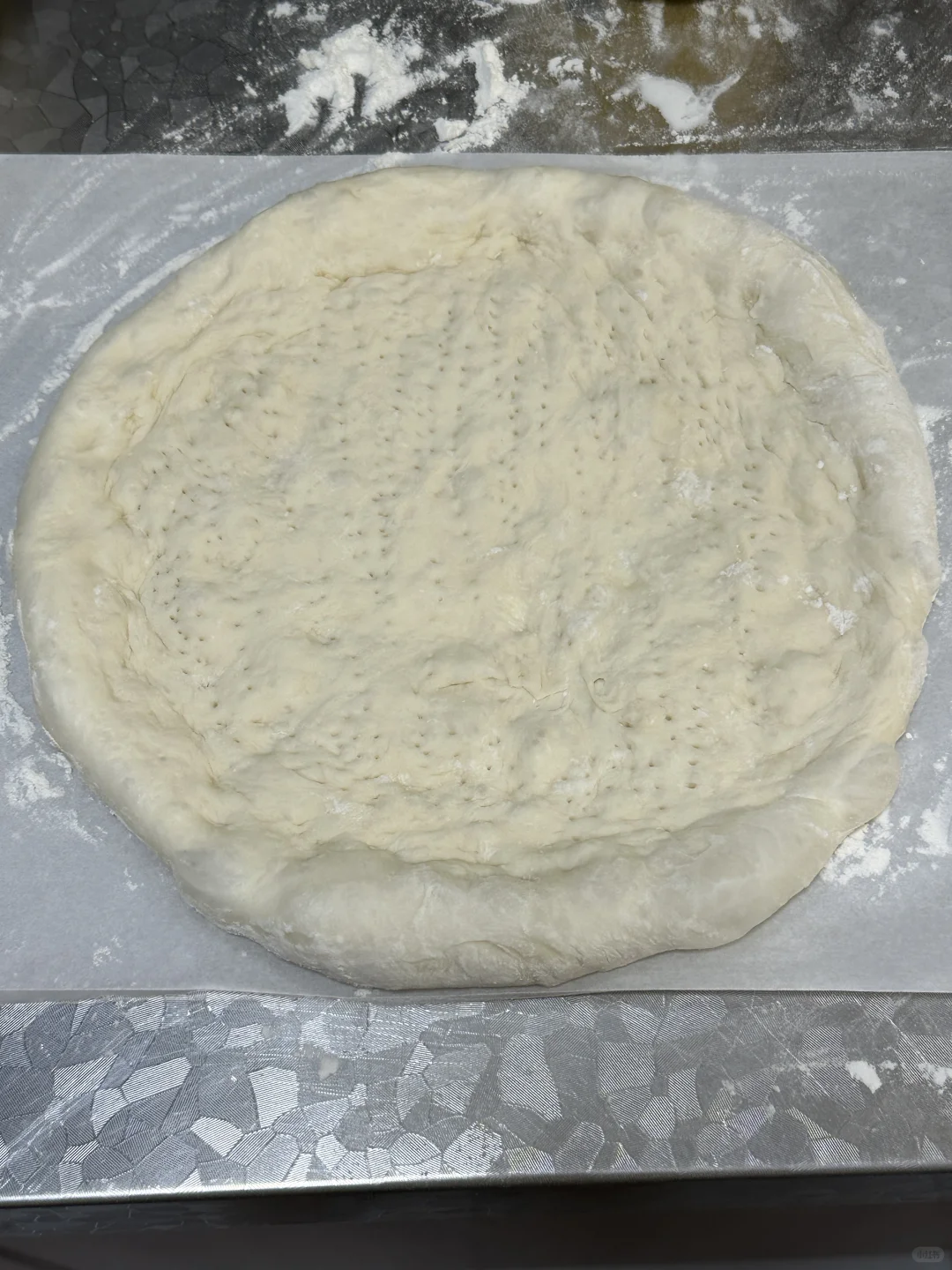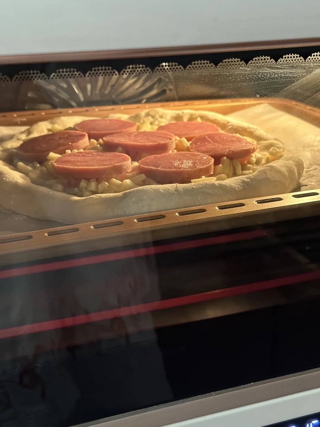5️⃣烤箱带烤盘提前预热230°,放入披萨烤15min即可出炉