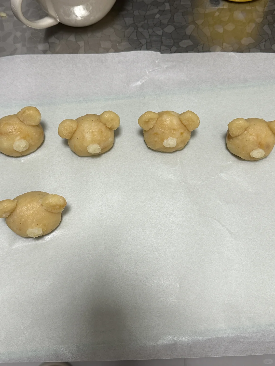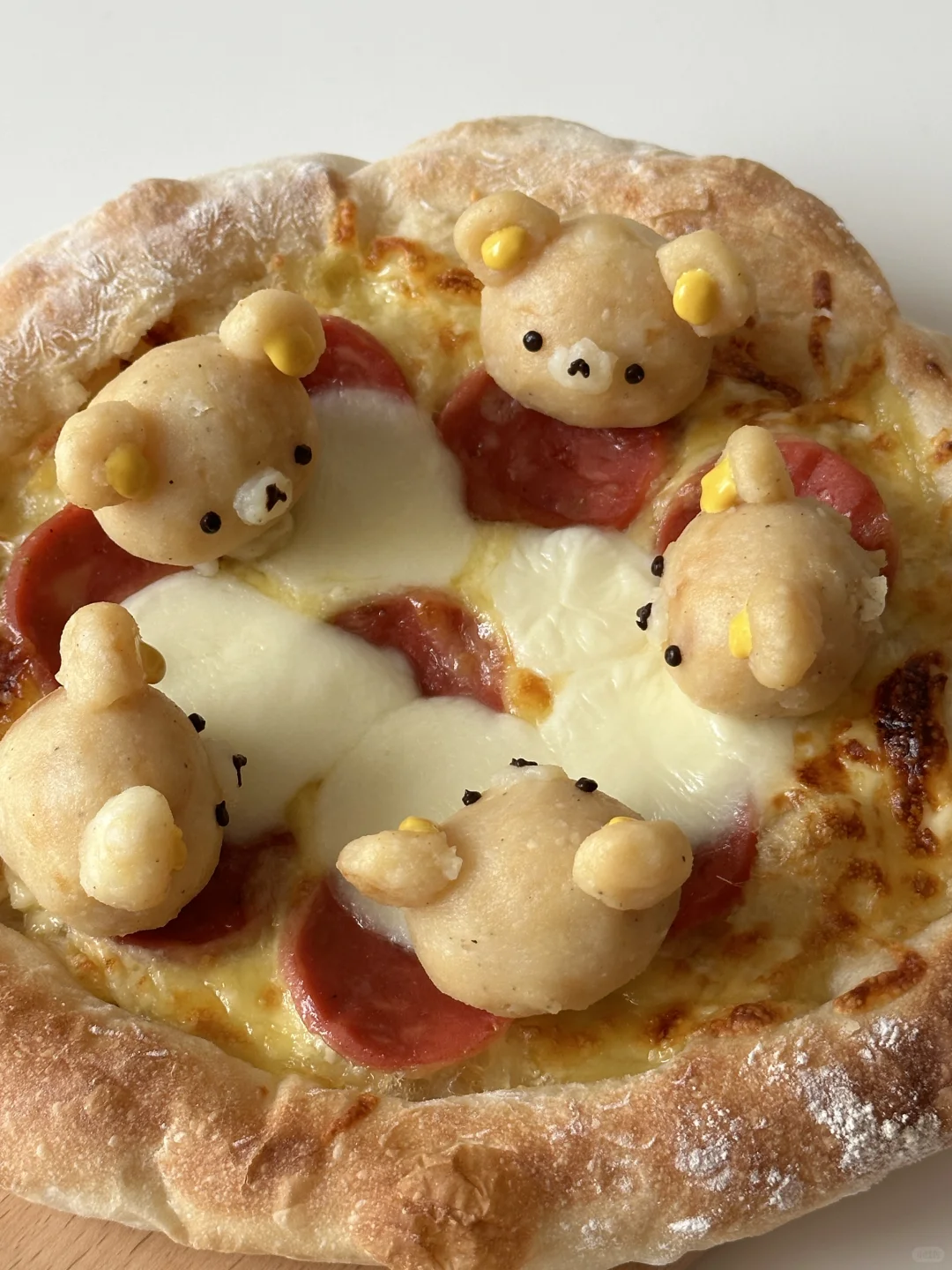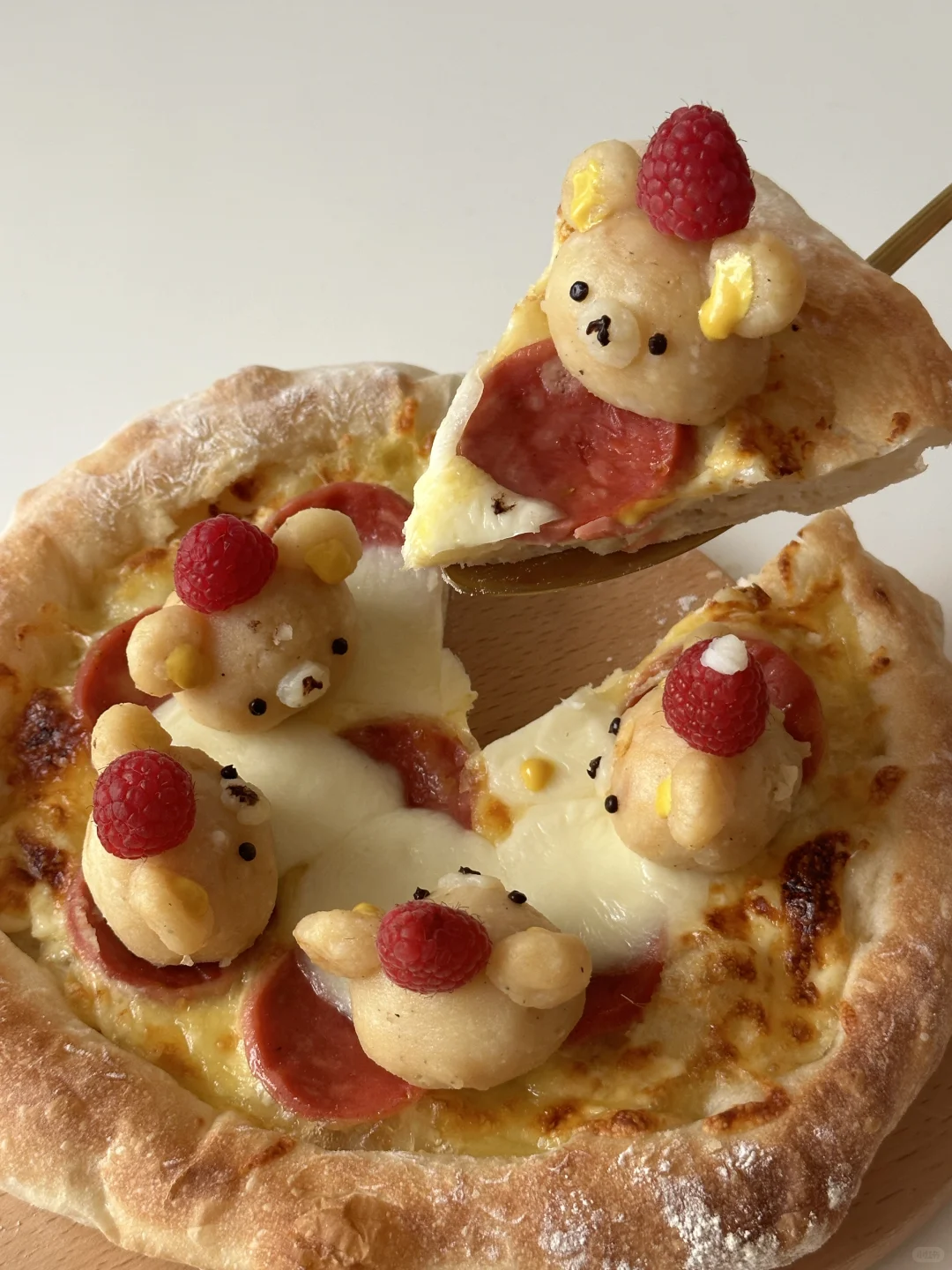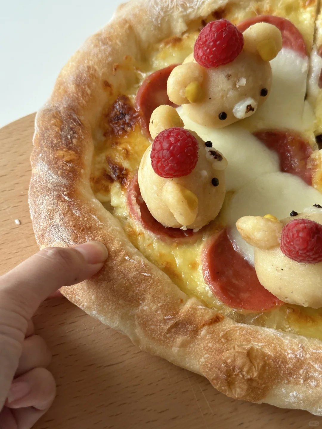 ⑦出炉后摆上上提前做好的土豆泥轻松熊,戴上树莓帽子(土豆泥蒸熟,加入黑椒海盐一丢丢黄油,压成泥,捏出轻松熊形状,黄色耳朵是黄芥末酱~)