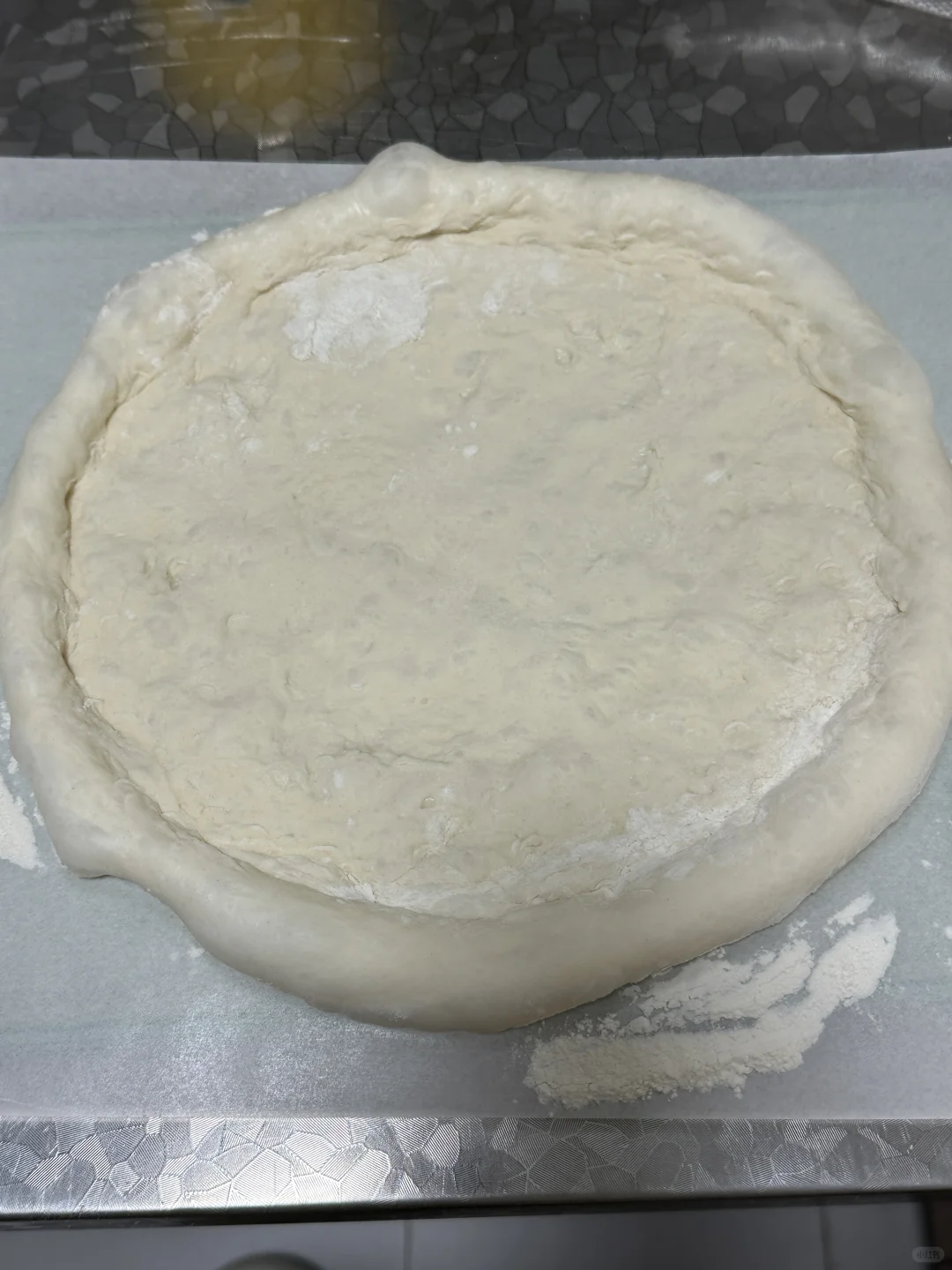 4️⃣手沾水从底部托起面团,面团全部裹上面粉防粘,放在披萨铲上,用双手按压,配合拳头心拉伸整形面饼