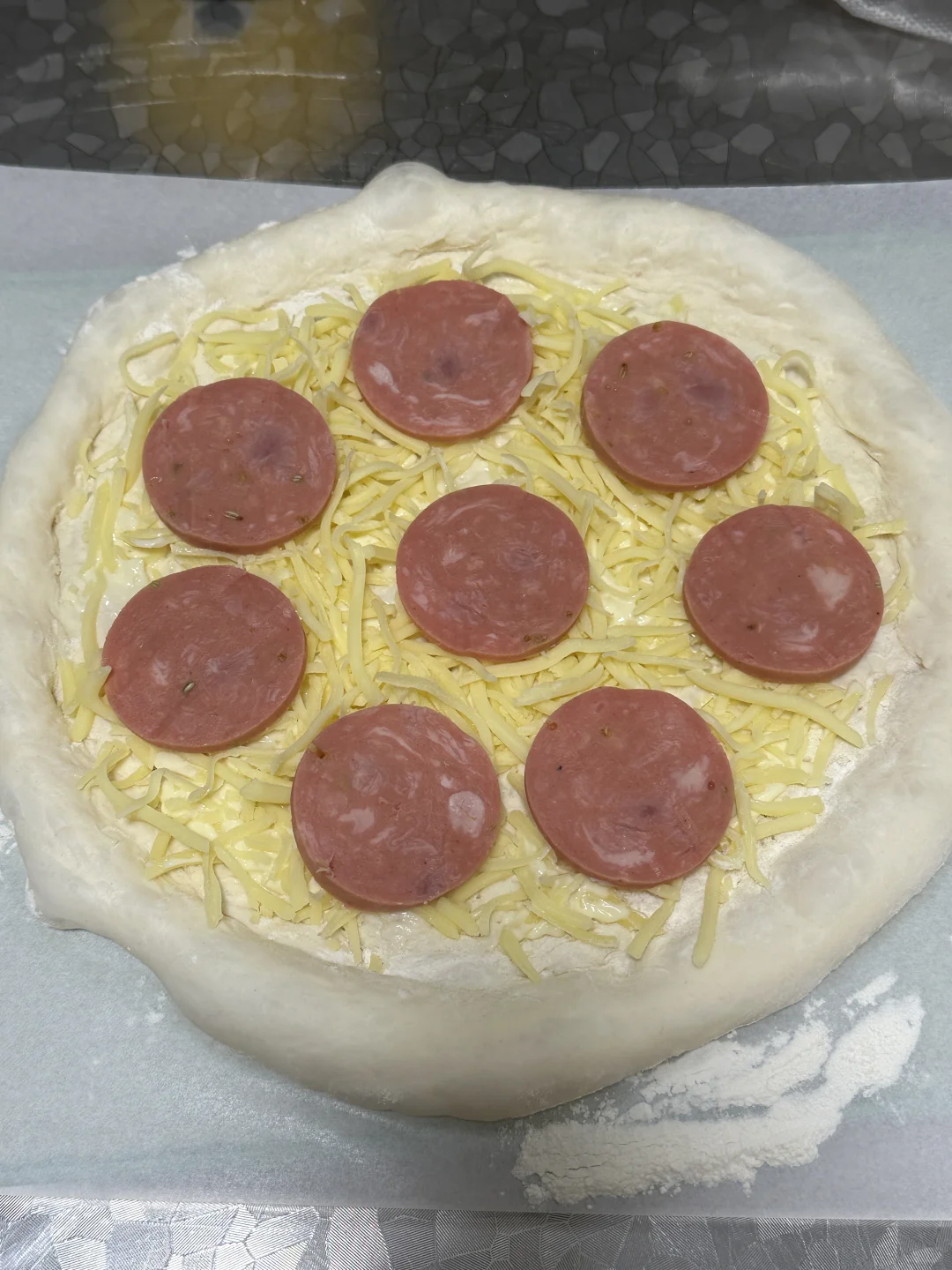 5️⃣涂上番茄酱,铺上厚厚的芝士碎,火腿片,等食材