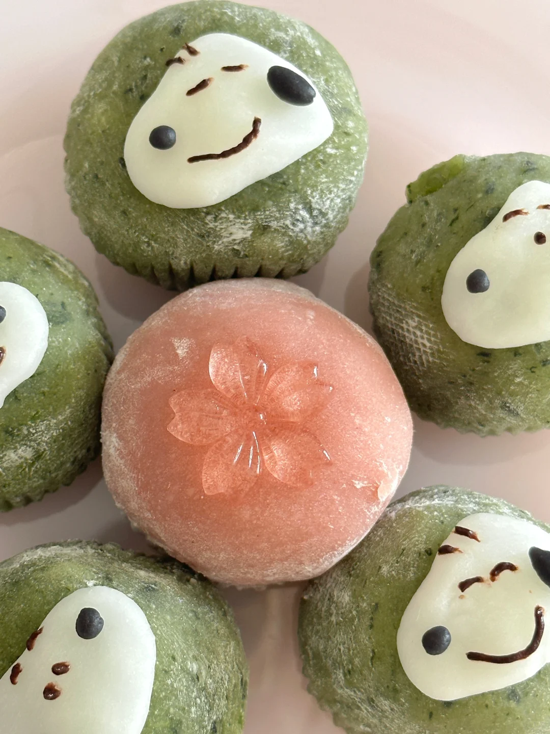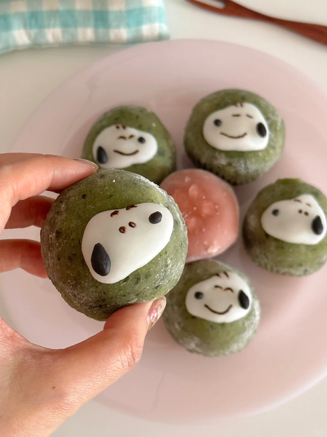 3️⃣捏出史努比形象,贴在青团上,巧克力笔装饰五官细节即可~
