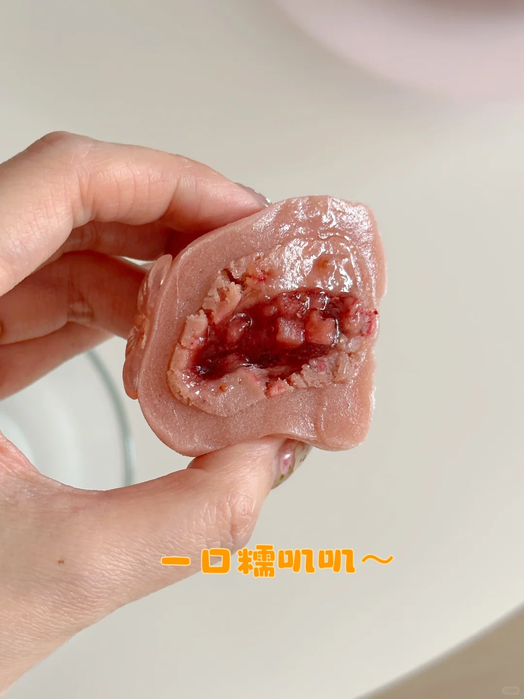 🌸草莓樱花麻薯:顶上一颗樱花➕红番石榴浓缩成的晶莹剔透的樱花软糖,搭配麻薯外皮,软糯Q弹,一口糯叽叽!里面包裹酸甜可口还能吃得到真实草莓颗粒的流心草莓酱,满口留香~