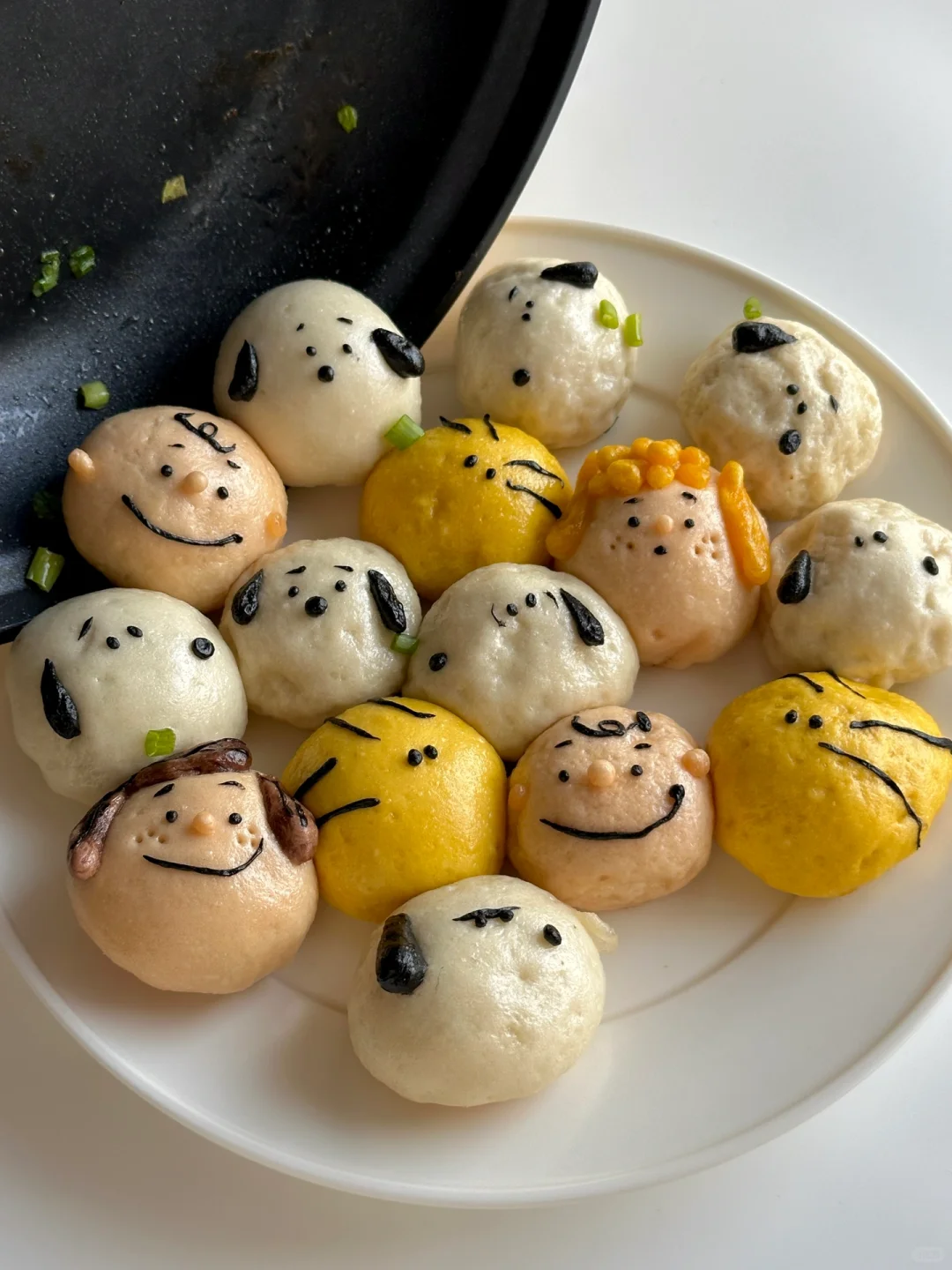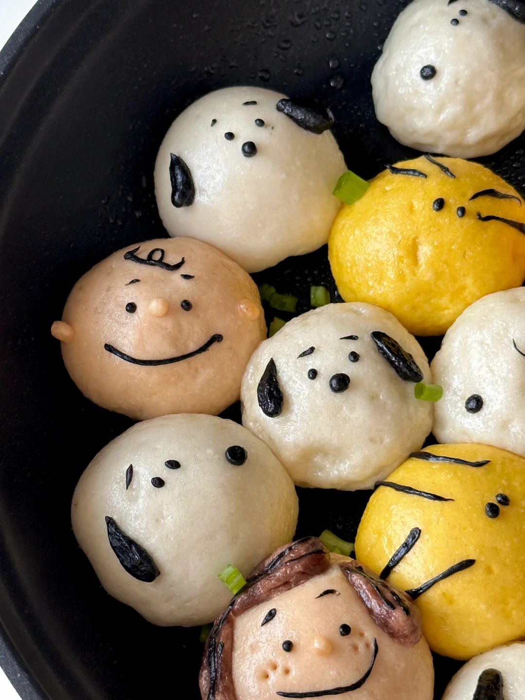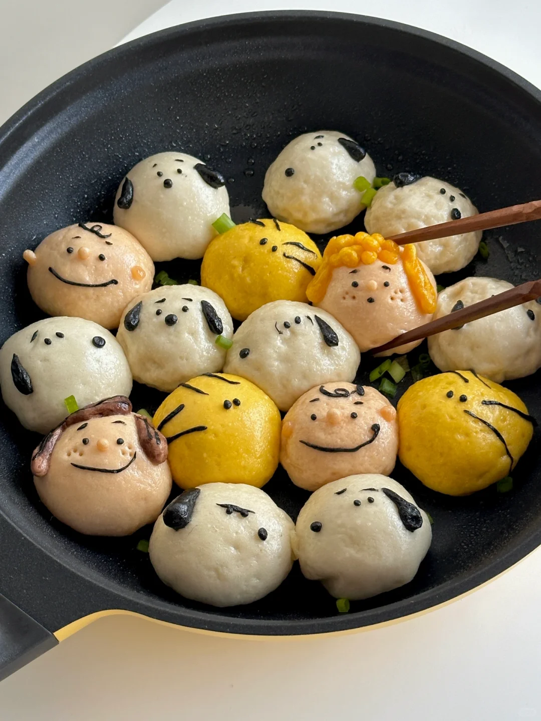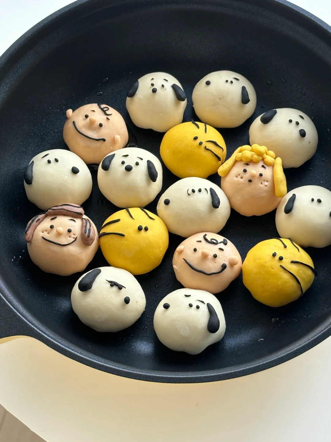 6️⃣平底锅刷油摆放包好的包子,做出人物细节