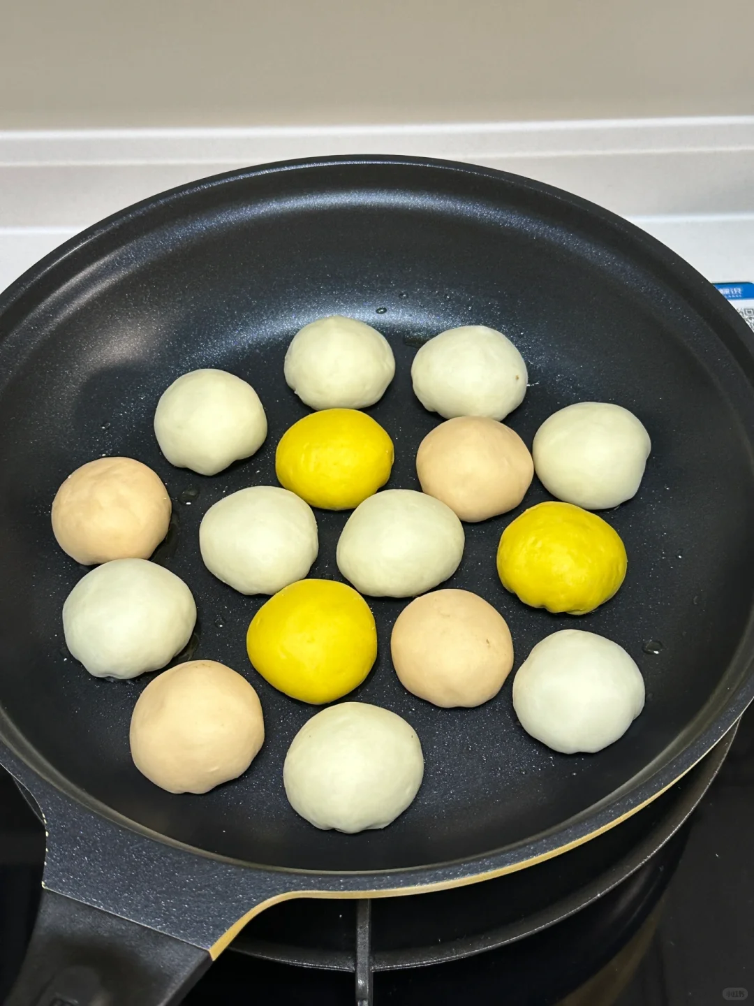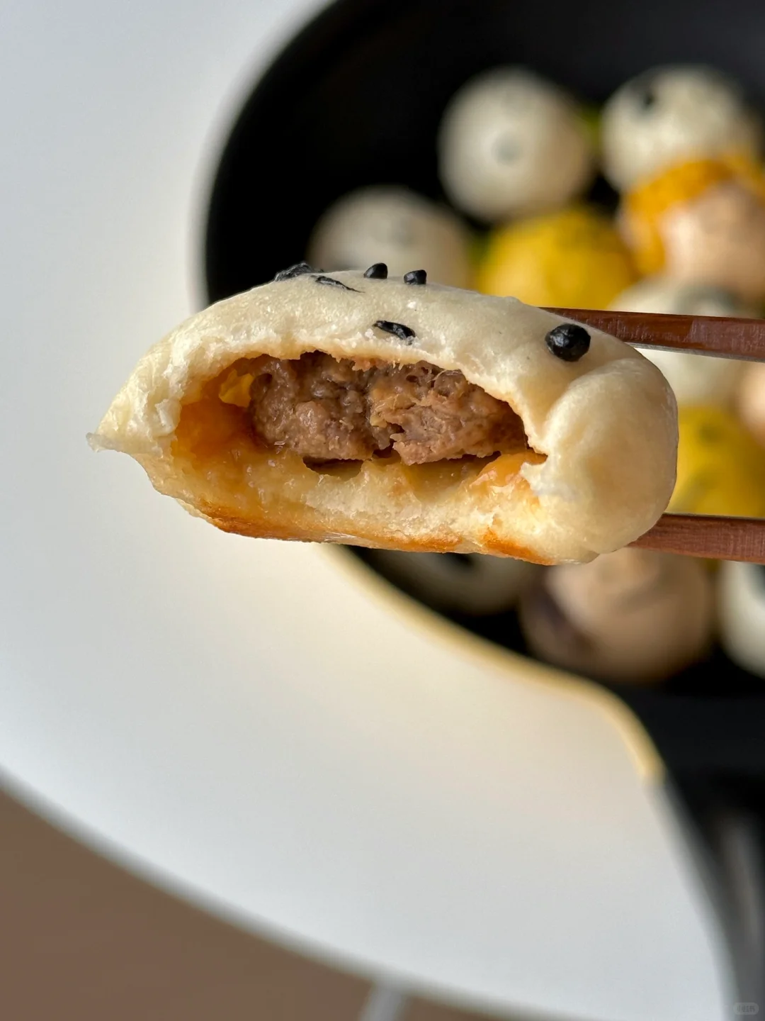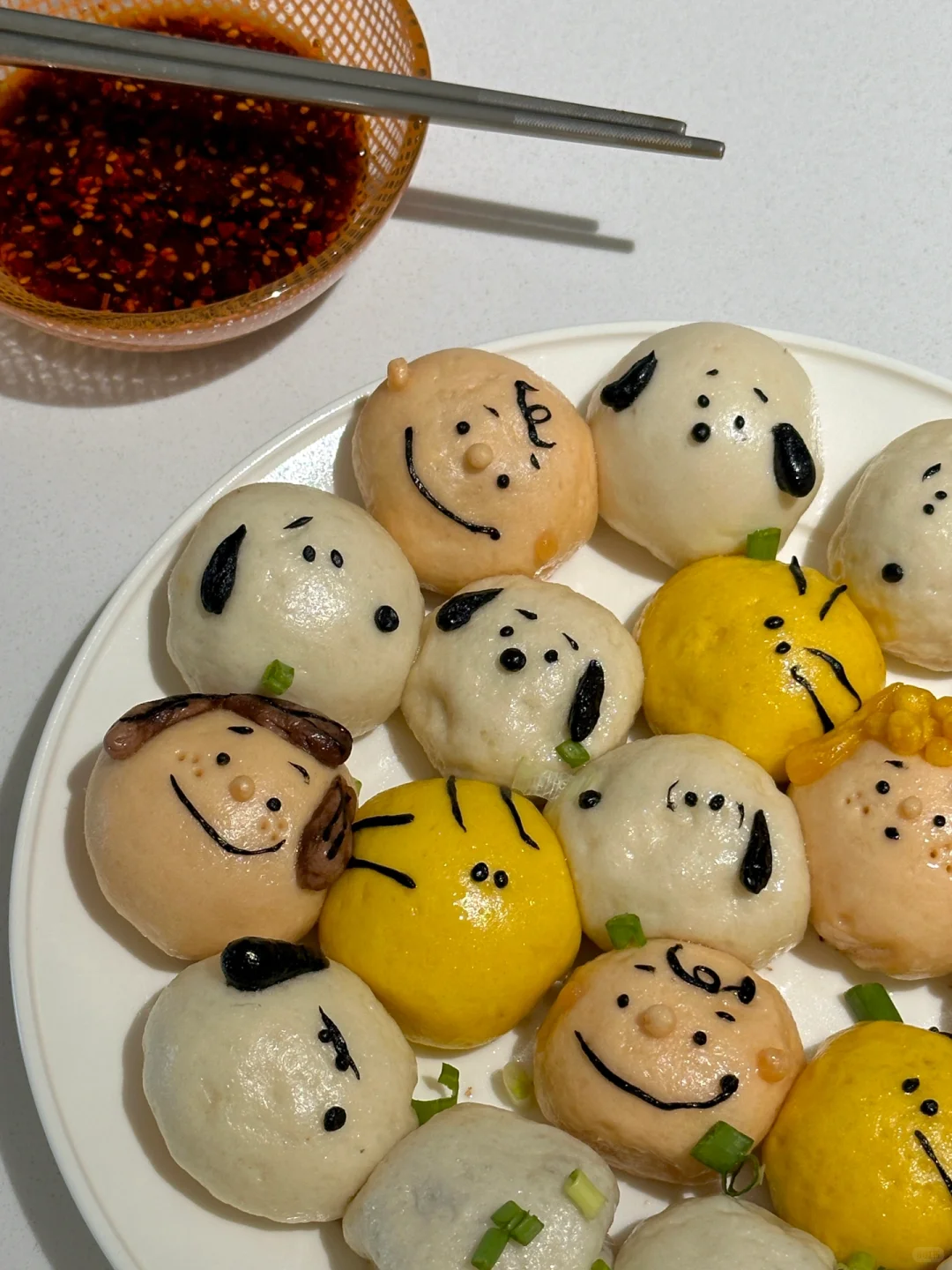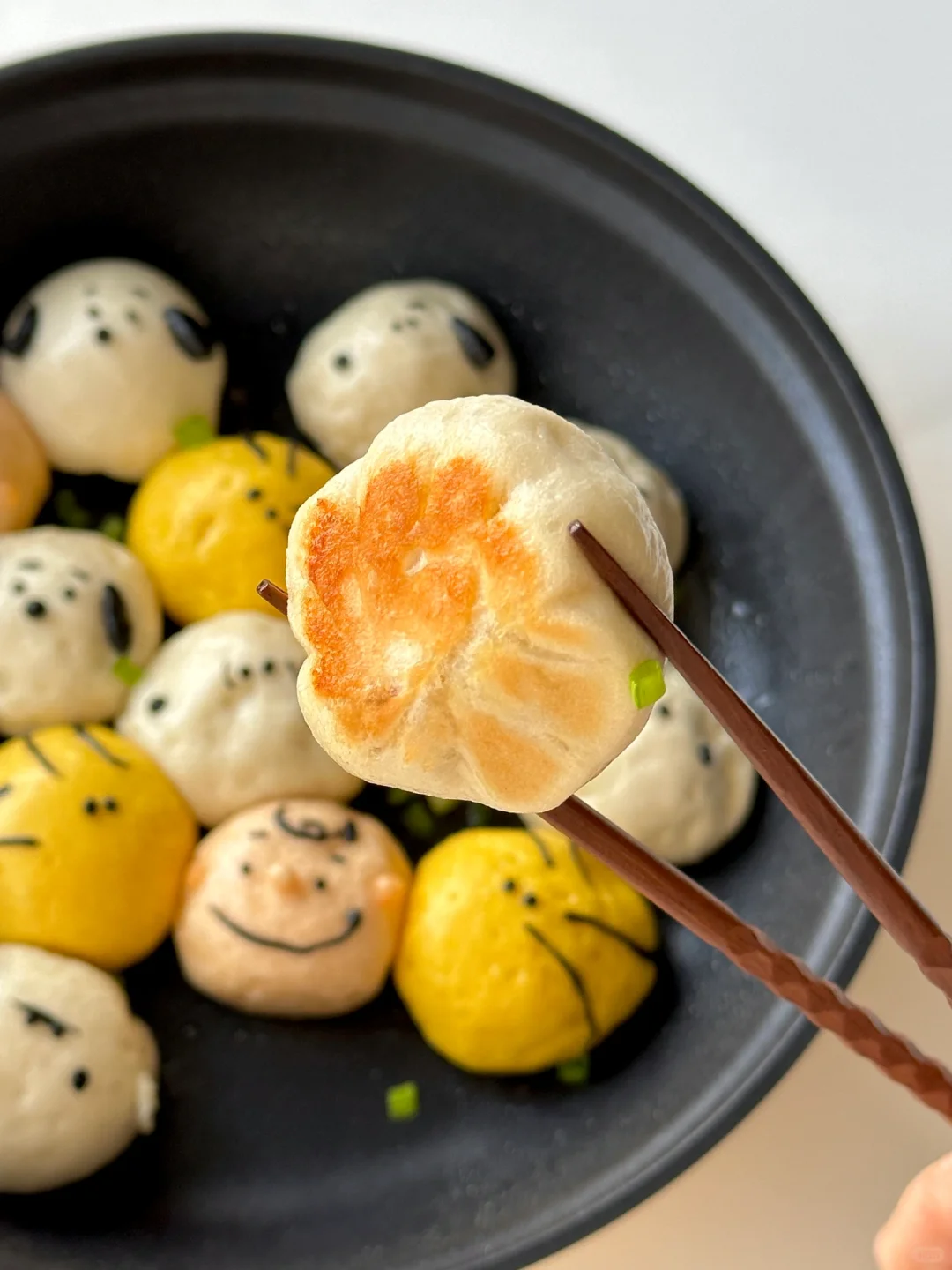 6️⃣平底锅刷油摆放包好的包子,做出人物细节