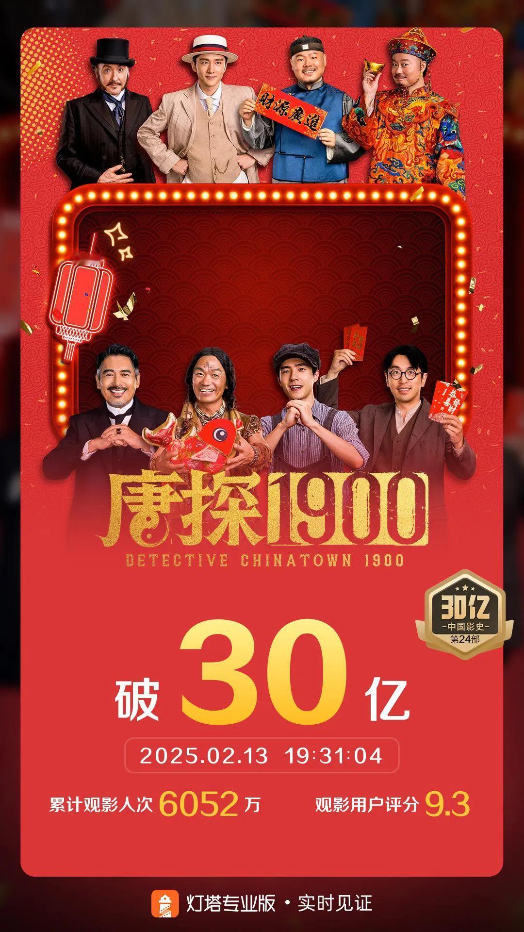 《唐探1900》票房破30亿,被《哪吒2》百亿压得无人问津 由陈思诚、戴墨联袂执导,王宝强、刘昊然领衔主演、周润发特别主演、白客、张新成、岳云鹏领衔主演的春节档动作悬疑喜剧电影《唐探1900》,累计综合票房破30亿,是中国内地影史第24部“30亿俱乐部影片”。 是的,在无人在意的角落,《唐探1900》票房破30亿了,这本来也算是值得庆祝的事情,但是此时大家都在庆祝《哪吒之魔童闹海》票房破百亿,只能让陈思诚闷声发大财了。