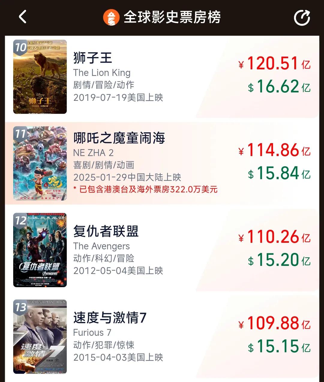 《哪吒2》内地票房破114亿,距离全球前十仅差一步 由饺子执导、吕艳婷、瀚墨、囧森瑟夫、绿绮、陈浩、张珈铭、杨卫等配音的春节档喜剧动画电影《哪吒之魔童闹海》,累计综合票房破114亿,已超过《战狼2》票房的2倍。 在国际舞台上,《哪吒之魔童闹海》在越来越多的国家上映,全球票房近115亿,已超越《复仇者联盟》、《速度与激情7》等片,暂居全球影史票房第11名,距离十强仅剩一步之遥。