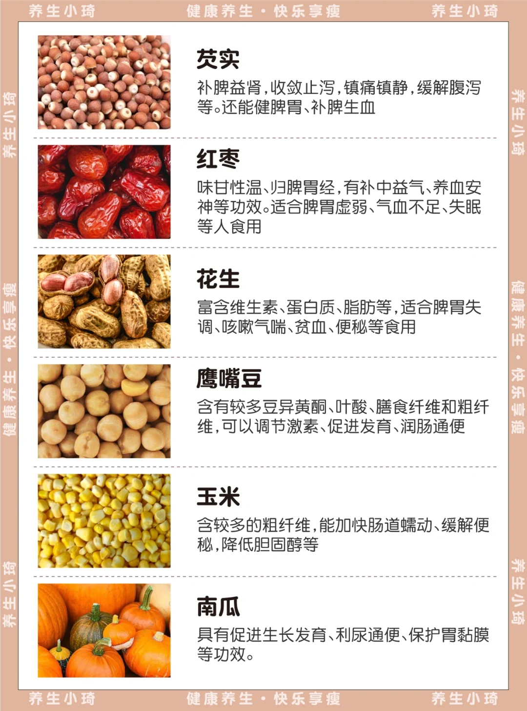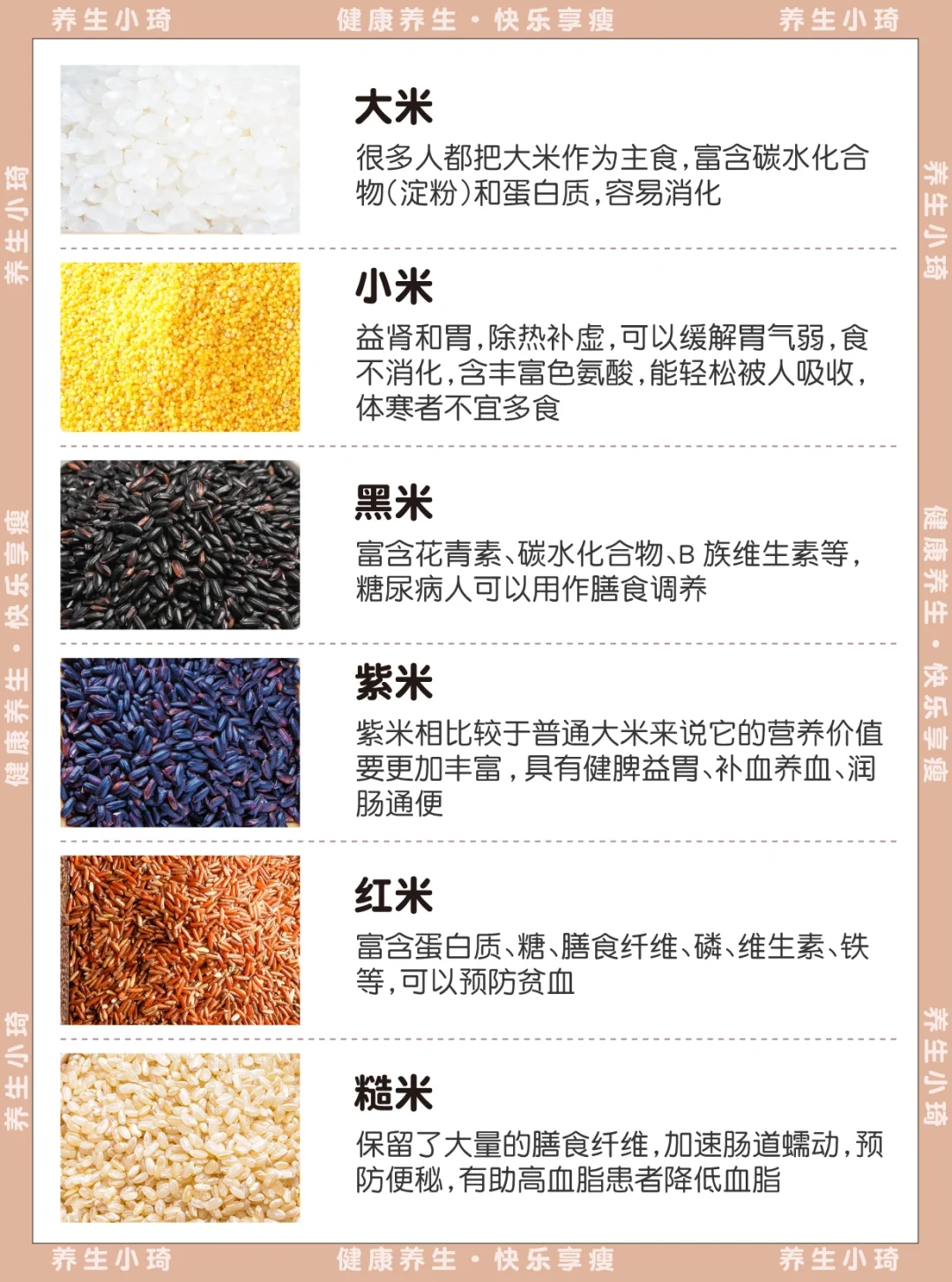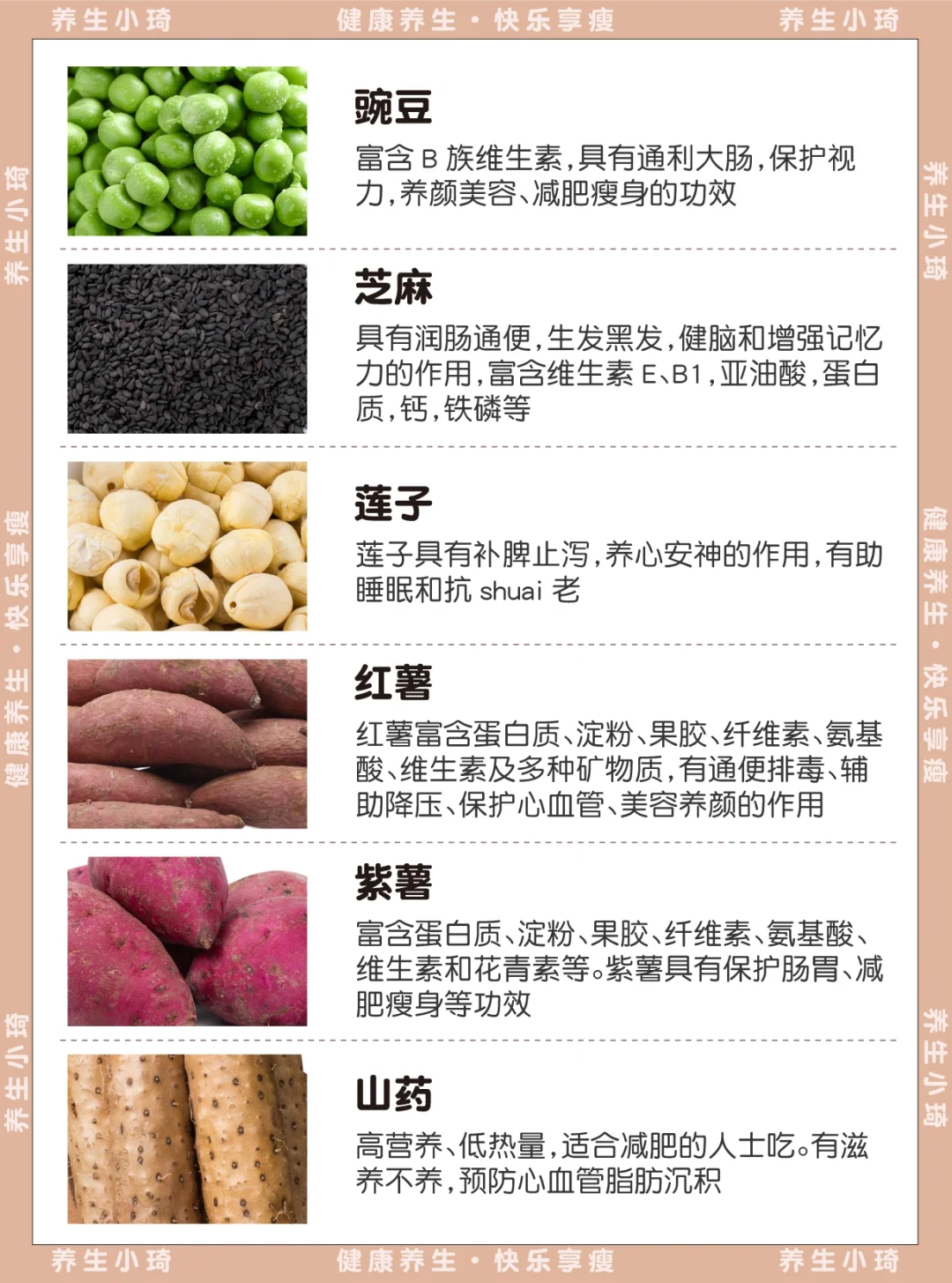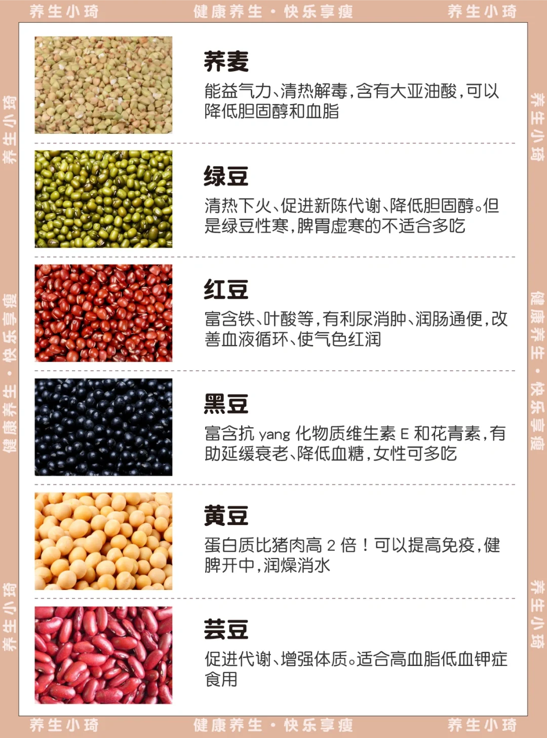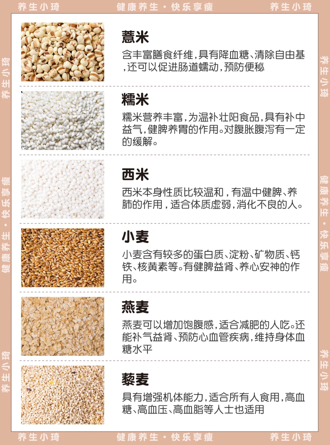 [向右R]《黄帝内经》中“五谷为养”,认为五谷杂粮不仅可以裹腹,也是养生的根本[赞R] [赞R]中国就是粮食大国,五谷杂粮很普遍 北方和南方虽有一些饮食的差异,但是终归离不开五谷杂粮[喝奶茶R] [向右R]主食不够多样化,长期会导致身体营养不均衡~ [拔草R]为了均衡营养,多吃五谷杂粮是很有必要的! [拔草R]比如豆类含有丰富的蛋白质、粗粮含有丰富的膳食纤维等,深受养生达人们的喜欢[赞R] [向右R]今天给各位养生达人们认识30种杂粮[赞R] 我们平时多吃些杂粮、粗粮,少吃精加工、高糖高胆固醇的食物