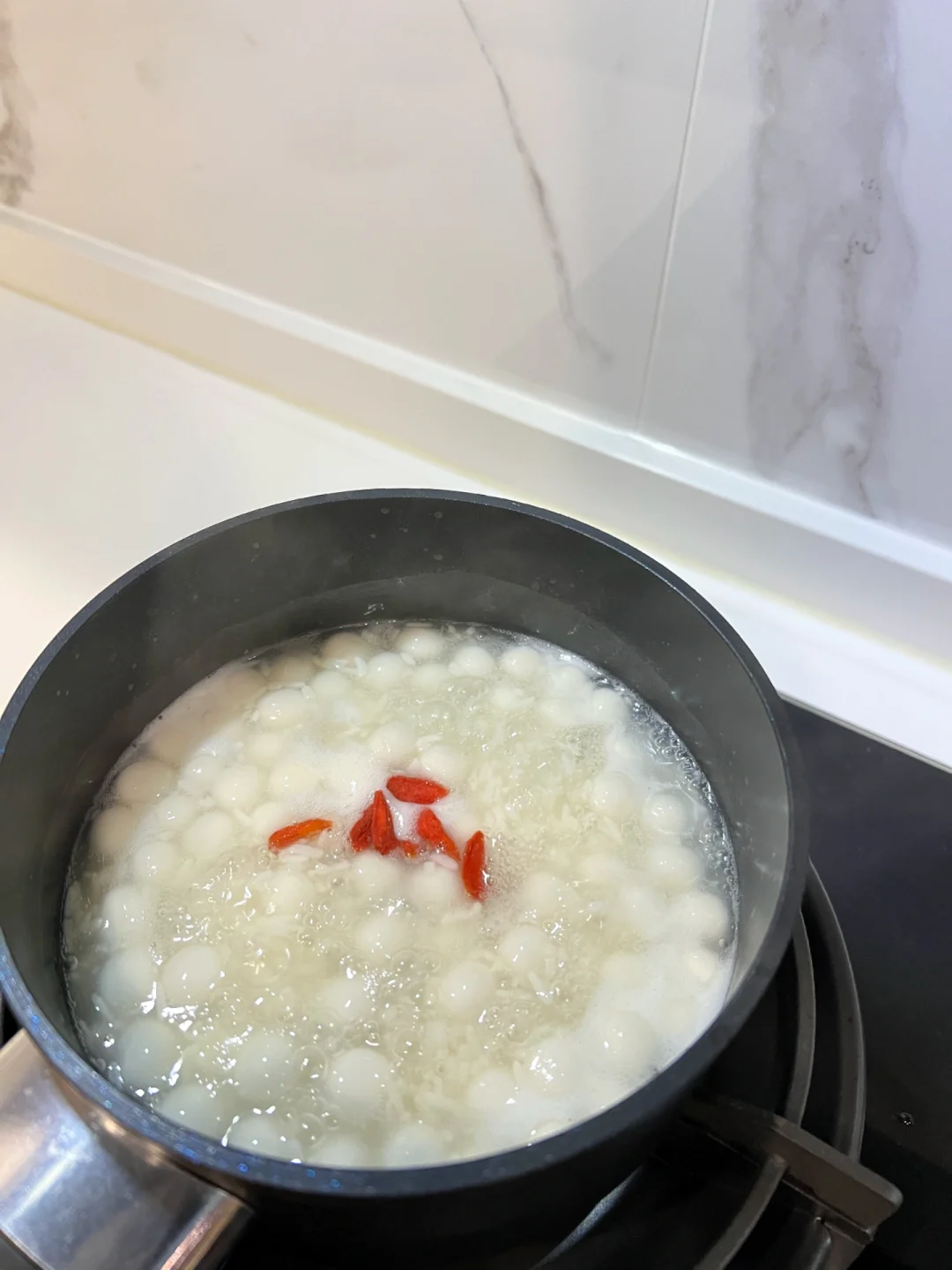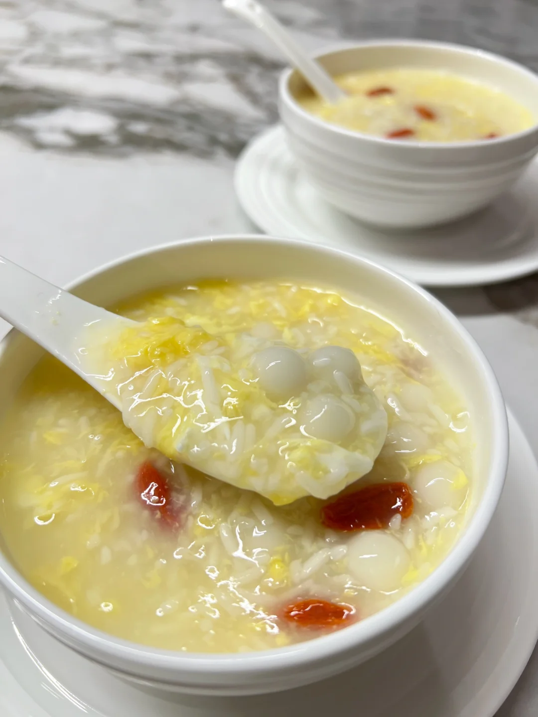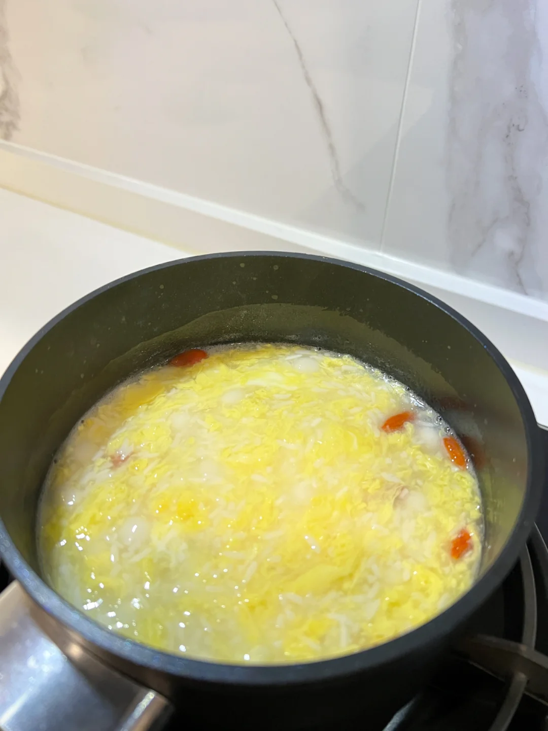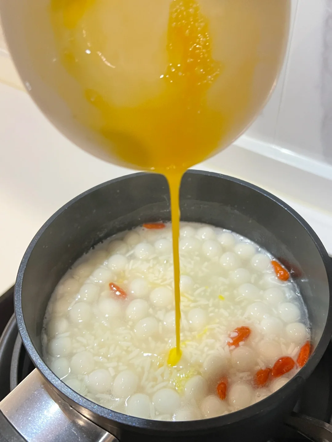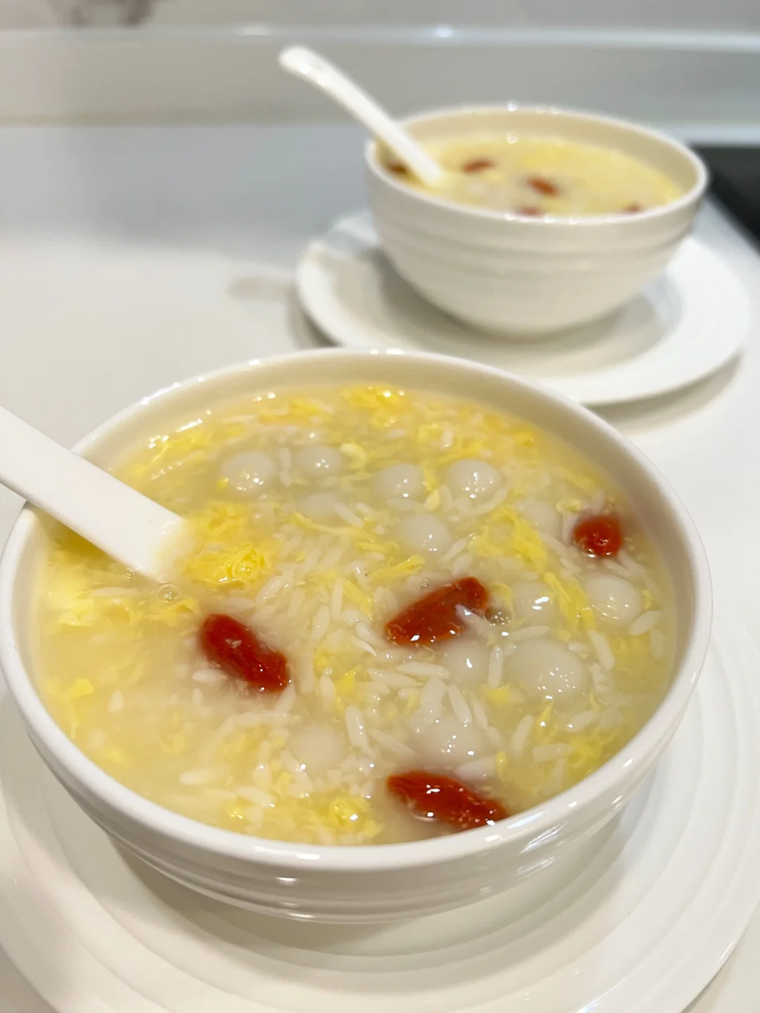 最近降温了,就想吃点热乎的酒酿圆子。只需要几分钟,马上可以拥有同款,赶紧安排起来! 怎么才能让蛋花又滑又嫩,就一定要关火以后倒进去,用剩余的热量烫熟鸡蛋。 👩🍳食材: 1⃣️糯米圆子100g 2⃣️酒酿100g 3⃣️鸡蛋一个 4⃣️枸杞子适量 5⃣️冰糖适量 🫕做法: 1⃣️饭碗一碗水烧开后,倒入糯米圆子,中火煮两分钟。 2⃣️酒酿倒入锅里,煮三分钟后,倒入淀粉水勾芡。 3⃣️放入少许冰糖跟枸杞子煮一分钟。 4⃣️鸡蛋打散,关火后,均匀倒入锅中,等两分钟鸡蛋被烫熟后即可。