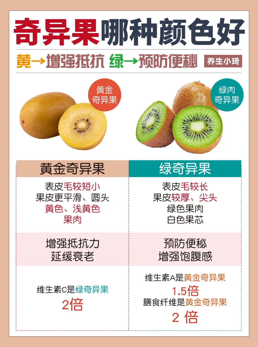 🥝奇异果不但含有大量营养,还有大量抗Y化剂,以及充足纤维。 [私信R]常见的奇异果分为绿色和金色,但除了颜色上不同之外,大家知道还有什么不同吗? - ⬇️营养大比拼(每100克营养计算)⬇️ . [星R]黄金奇异果 热量:63千卡 糖分:15.8克 维生素A:67毫克 维生素C:161.3毫克 膳食纤维:1.4克 钾:315毫克 . [星R]绿奇异果 热量:58千卡 糖分:14克 维生素A:110毫克 维生素C:74.7毫克 膳食纤维:3克 钾:198毫克