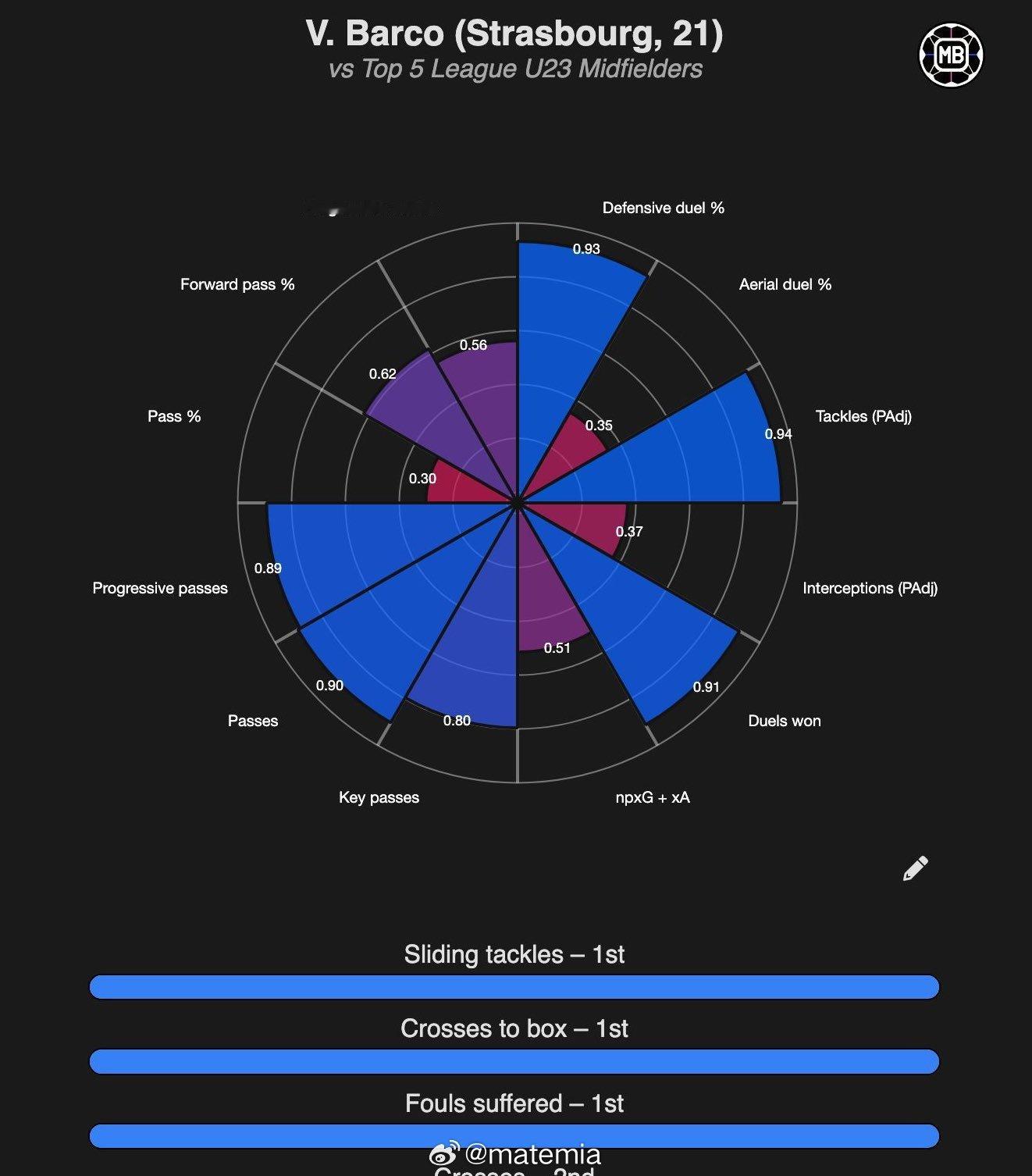 🇦🇷🥶 | 瓦伦丁-巴尔科(𝟐𝟏岁) 在五大联赛U23 中场球员中: