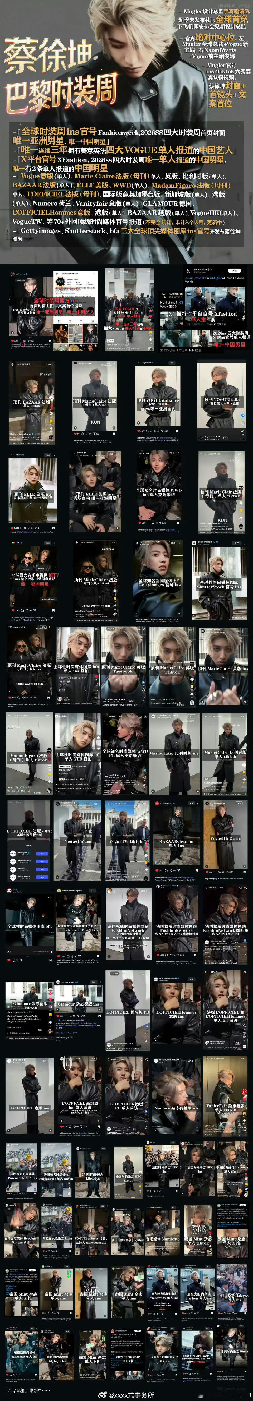 蔡徐坤此次大秀全球时装周官方ins首页封面主图+文案首位提及亚洲男星、唯一中国