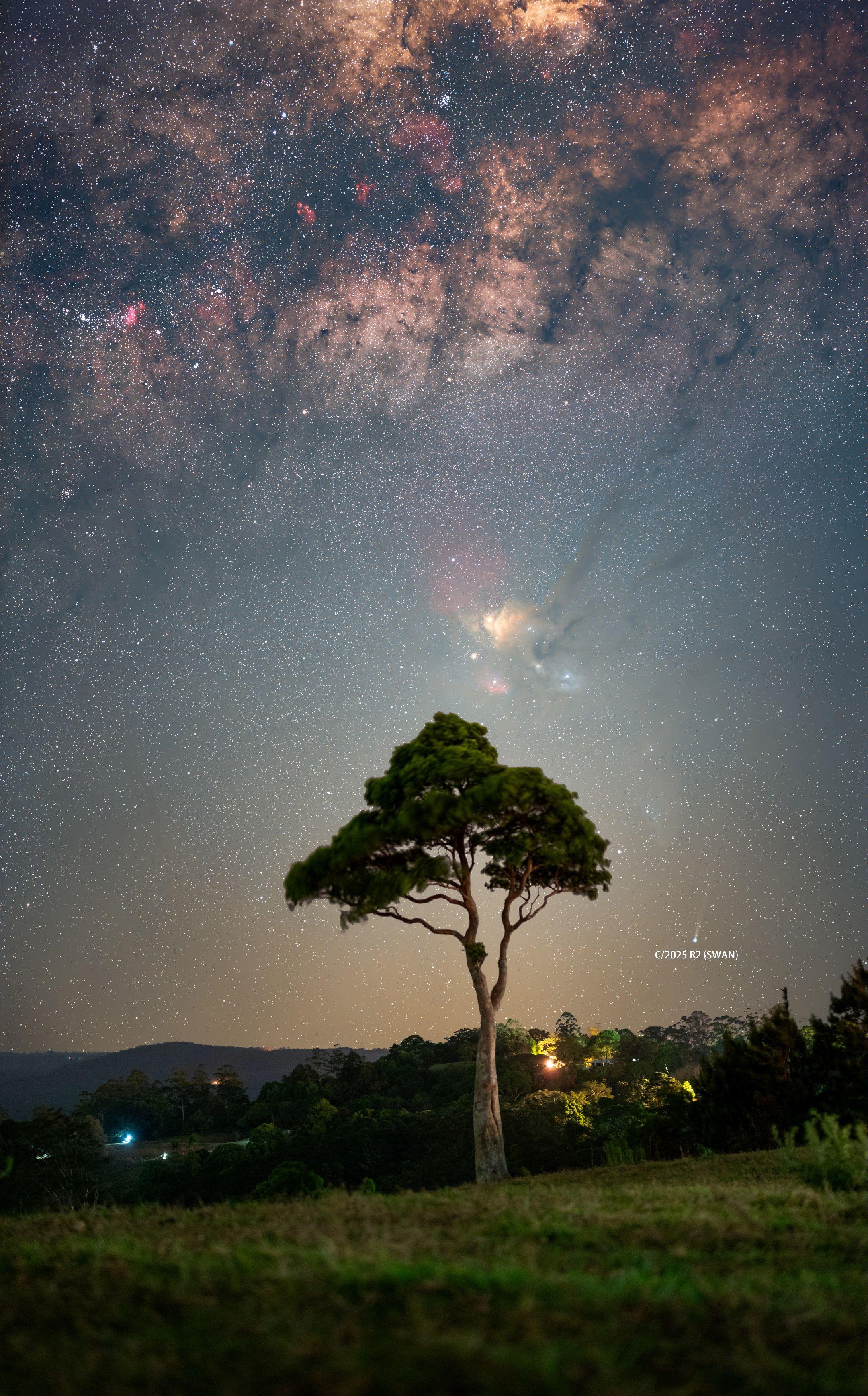 南半球四级光污染下的彗星C/2025R2。上周尝试拍这颗彗星时200mm只能看到一点点,最近在中焦段已经可以明显的看见了。 可能因为光污染较大并且有山火能见度也很差,所以还是拍不出很明显的慧尾。 南半球日落后西方的天空天蝎座右下方可以找到这颗彗星。 📷:索尼a7r3 50GM 参数:f1.4,iso800,快门30秒,40张