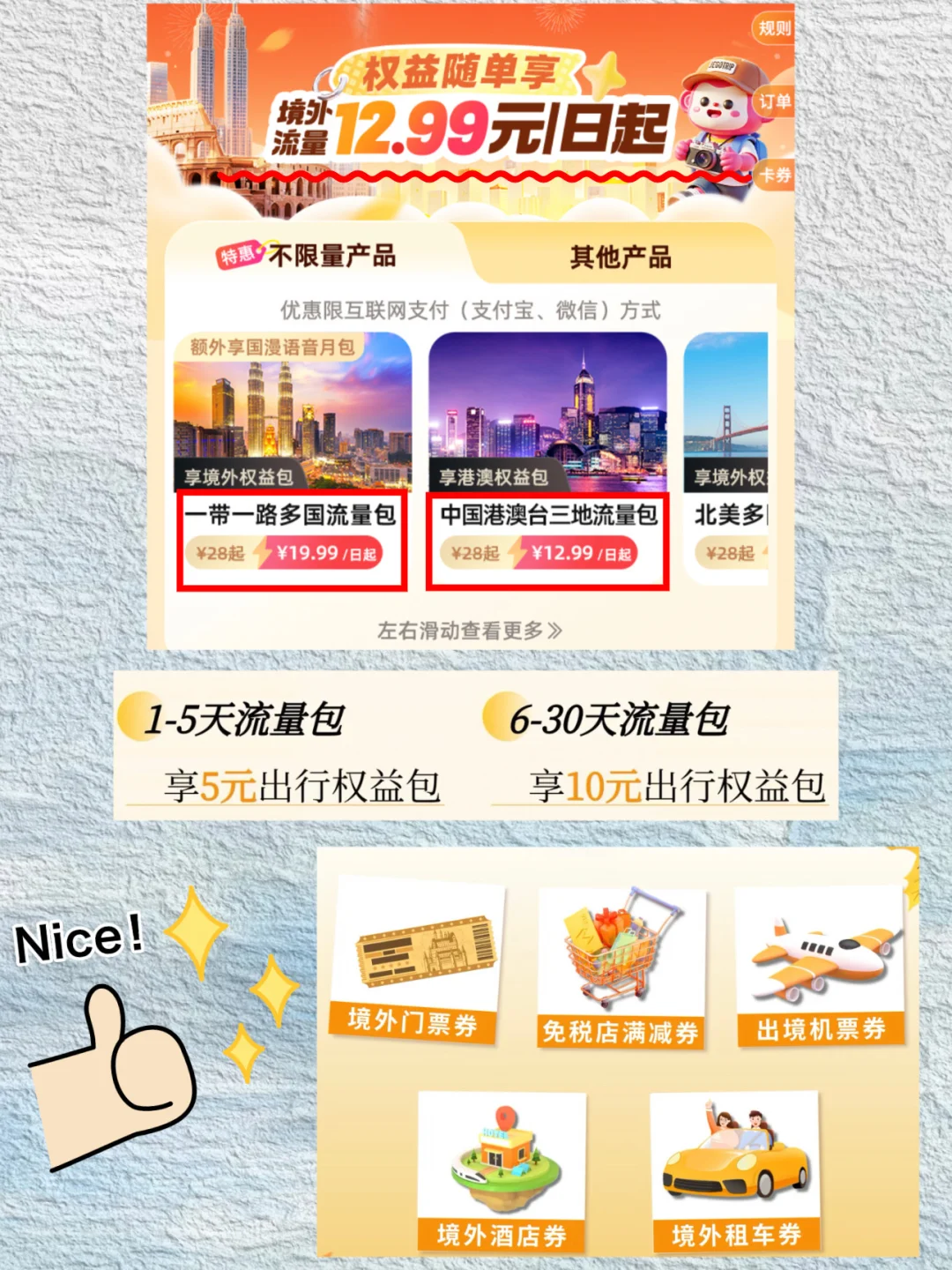 1-5天流量包→送5元权益包,6-30天→送10元出行权益包,不封顶!买几次送几次!太划算了