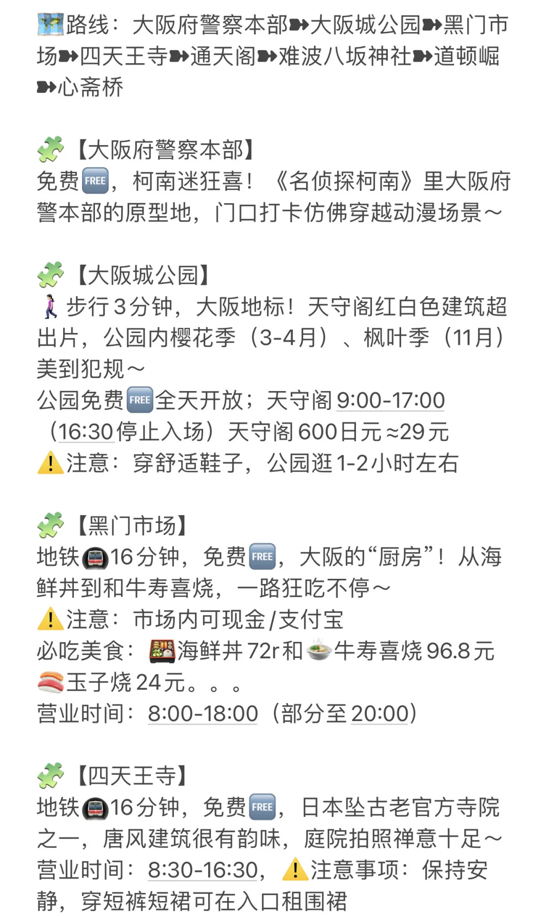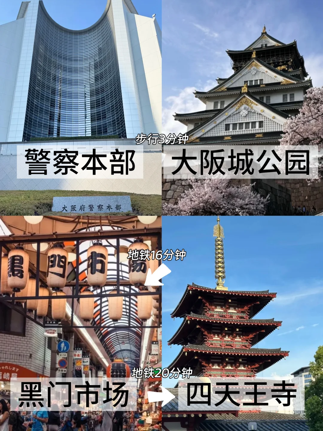 🗺️路线:大阪府警察本部➽大阪城公园➽黑门市场➽四天王寺➽通天阁➽难波八坂神社➽道顿崛➽心斋桥