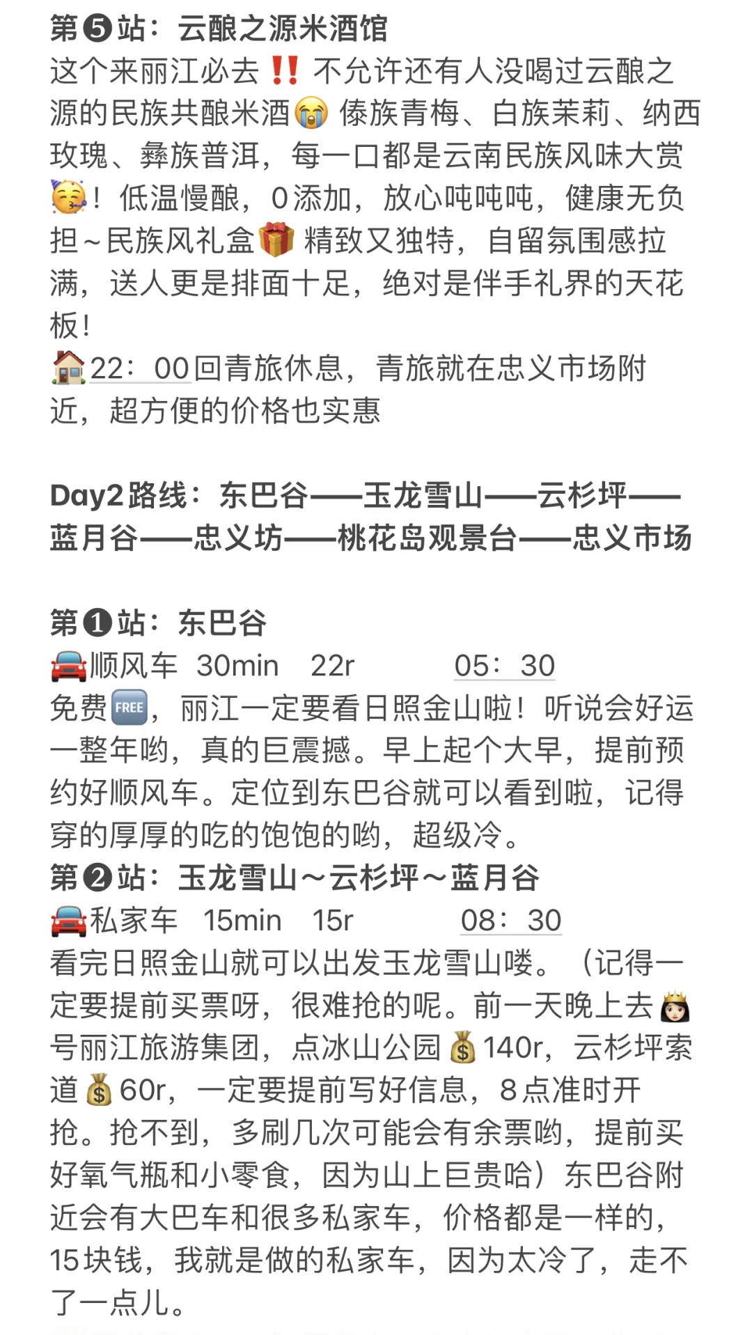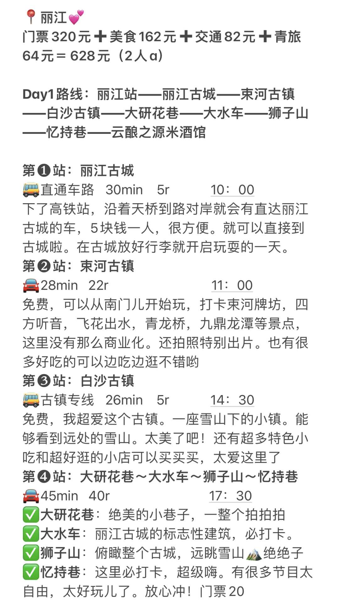 Day1路线:丽江站——丽江古城——束河古镇——白沙古镇——大研花巷——大水车——狮子山——忆持巷——云酿之源米酒馆