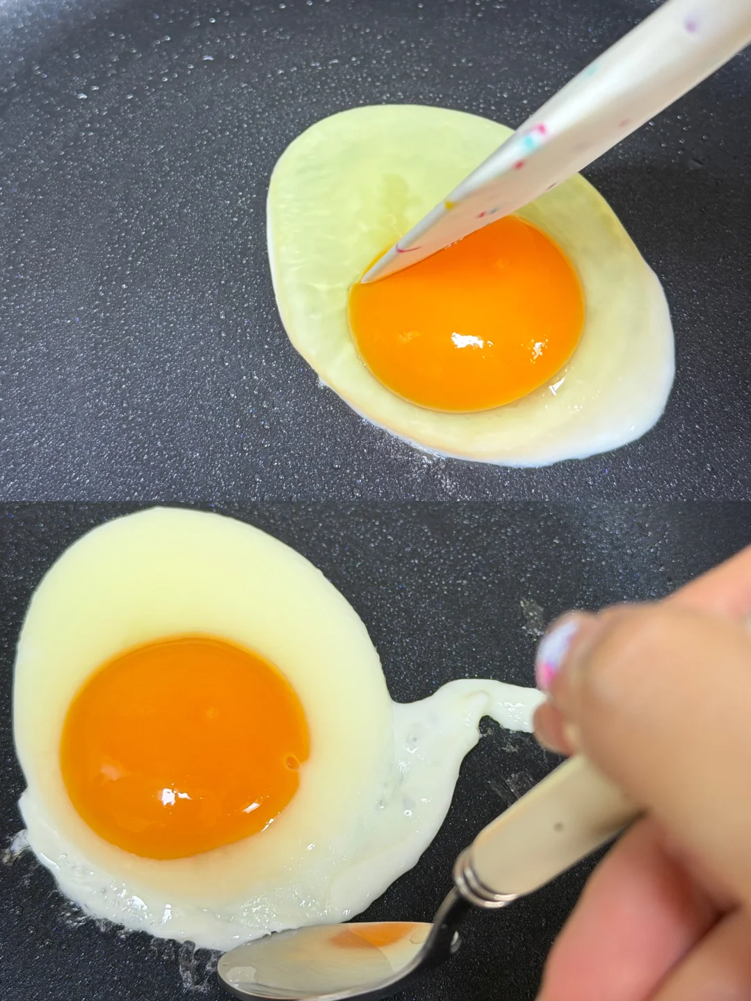 1️⃣生鸡蛋放在细筛中过滤稀蛋清 2️⃣平底锅刷油,将鸡蛋放入平底锅小火慢煎~ 3️⃣用小勺子舀取筛出来的稀蛋清,在平底锅画出细节部分 4️⃣海苔装饰表情~