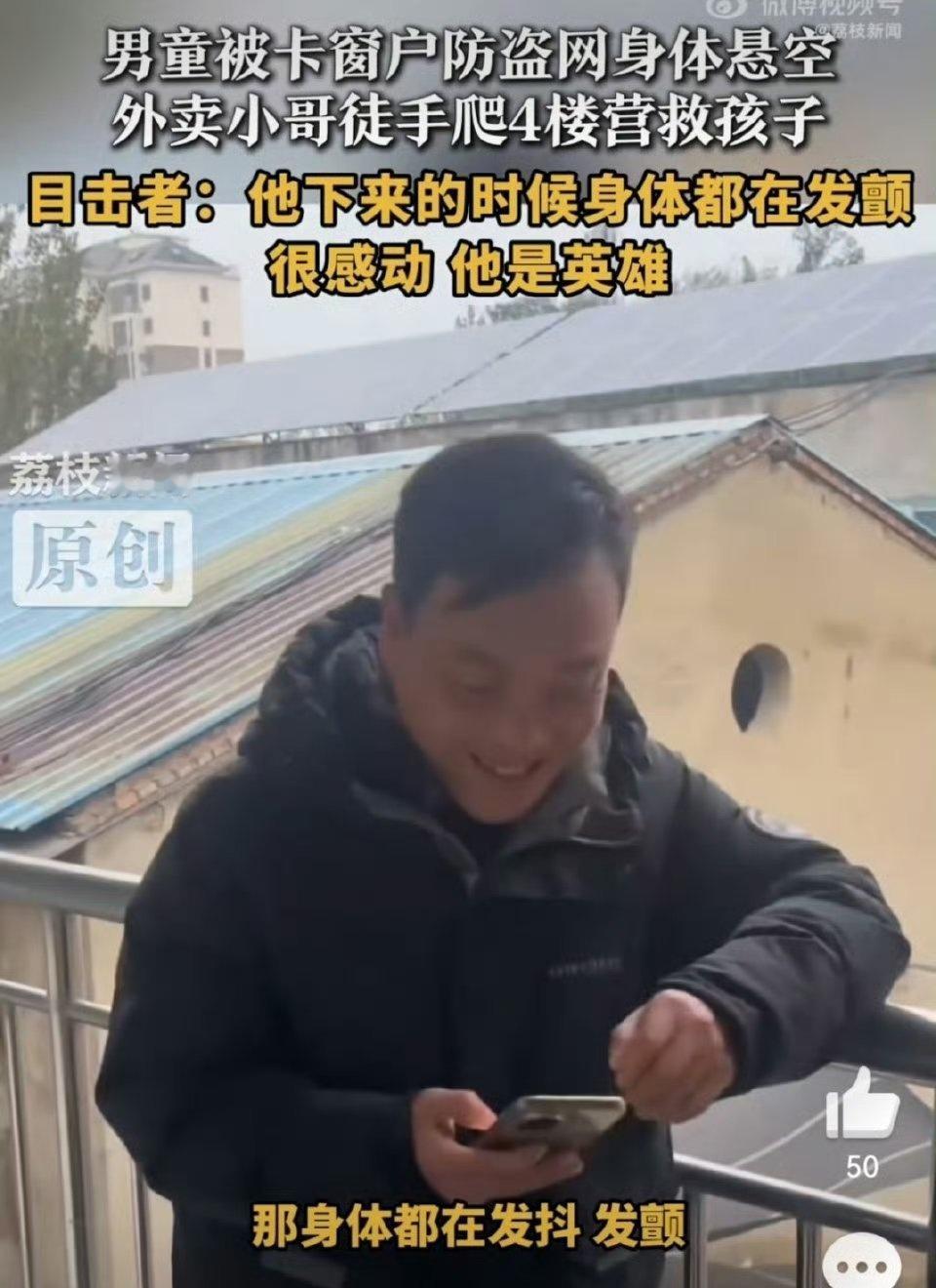 男童悬在半空外卖员徒手爬4楼救人外卖小哥徒手爬4楼救下卡窗男孩危急时刻,外卖小哥不顾危险徒手攀楼,稳稳托住悬窗男童!这一臂之力,是平凡人挺身而出的英雄气,太让人感动!