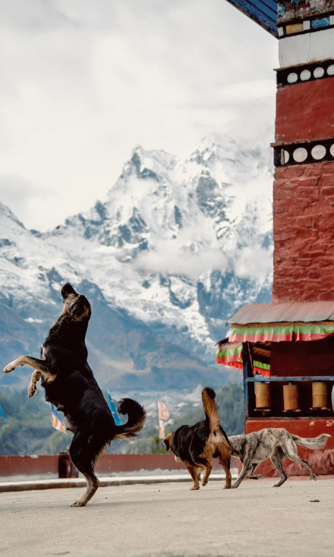 但是由于到的太晚没有拍好,不甘心,第二天一早又出发再来一趟。一开始雪山全部被厚厚的云层挡住,当时心想完蛋啦,但是乐观地劝自己说,去普隆寺看看寺庙吧!