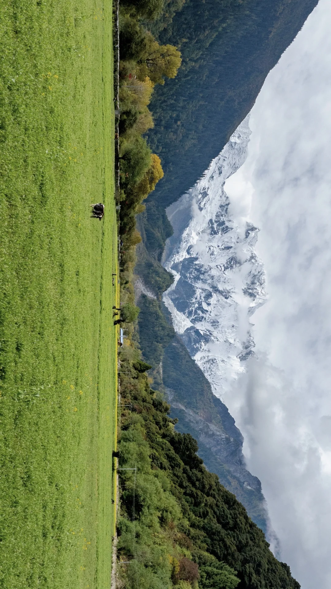 傍晚来到这个寂静的小村庄,只看到牦牛的身影。车子转了个弯后,一堵巨大的雪墙出现在眼前。当地人跟我说:这里看到雪山的效果和南迦巴瓦峰是一样的。