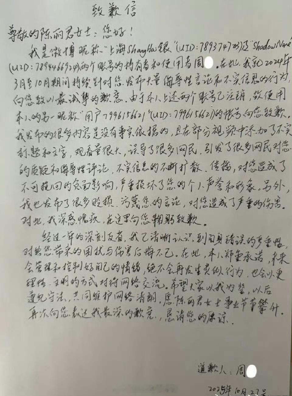 黑粉向陈丽君女士公开视频致歉及手写道歉信致歉,爽了