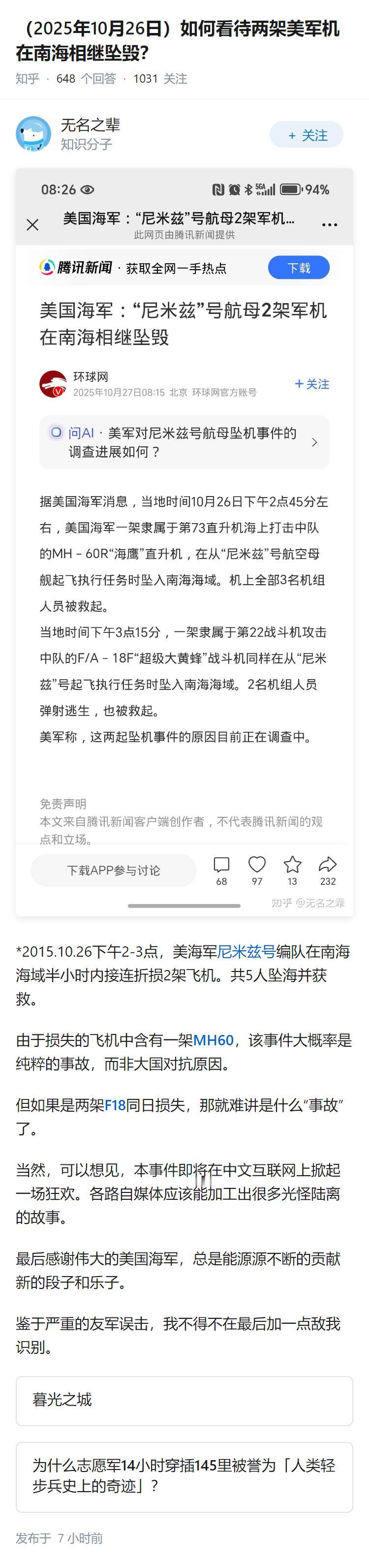 《【🔥热搜榜第7名】外网看美国两架军机在南海坠毁,热评:这是谁干的?好难猜啊》