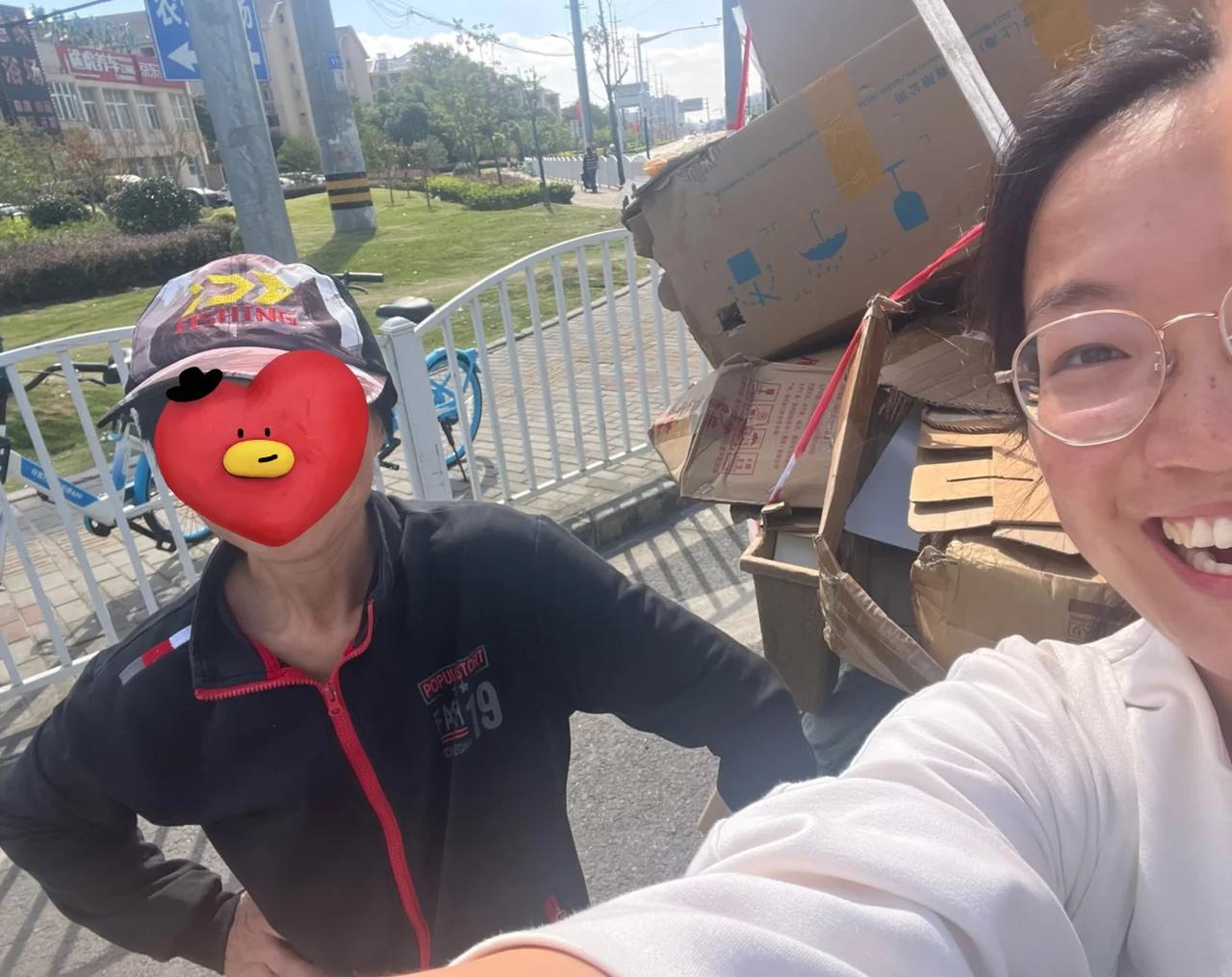 热心市民春春帮安徽沪漂阿姨卖垃圾🗑️ 今天在学校门口的十字路口,发现一堆废纸壳在来来往往的车辆中一点点往前挪。 我本以为这是一辆脚踏三轮车,仔细一看竟然是一个小拖车,一个阿姨拉着高高一车垃圾往前走。只是阿姨太瘦小了,被纸壳档得严严实实,根本看不见人! 更糟糕的是,不知道阿姨是不会看红绿灯还是着急赶路,她竟然准备在红灯的时候斜穿到马路对面! 这也太危险了!!! 热心市民春春立马把小黄车停在路边,跑到阿姨身边,帮她把小推车快速拉到路边。 阿姨告诉我,他是要拉去卖掉,破烂回收厂就在前面不远处。我当时想,反正也不着急,帮阿姨拉过去好了~ 没想到这个“不远”,竟然在1.5公里之外!我们俩在自行车道艰难地拉着小拖车一点点往前挪,中间停下休息了一会,唠了唠家常,虽然听不太懂阿姨的安徽话,但我大概知道她是农村来上海打工的,她老公在附近中学当老师,每周她们学校的四个阿姨会一起积攒一些纸壳子,然后阿姨就会用车拉到废品厂,卖掉的钱四个阿姨平分。 阿姨家里有两个儿子,都已经娶妻生子,但是大儿子赚钱不多,所以她孩子努力赚钱托举孩子。 我们休息的时候,我和阿姨一起拍了两张照片。 远处是上海林立的高楼,眼前是小推车和废纸壳,还有聊得正欢的我俩~ 感谢热心人 热心市民 上海大学 安徽人 沪漂 助人为乐 实实在在做事 党员日常沪漂日常