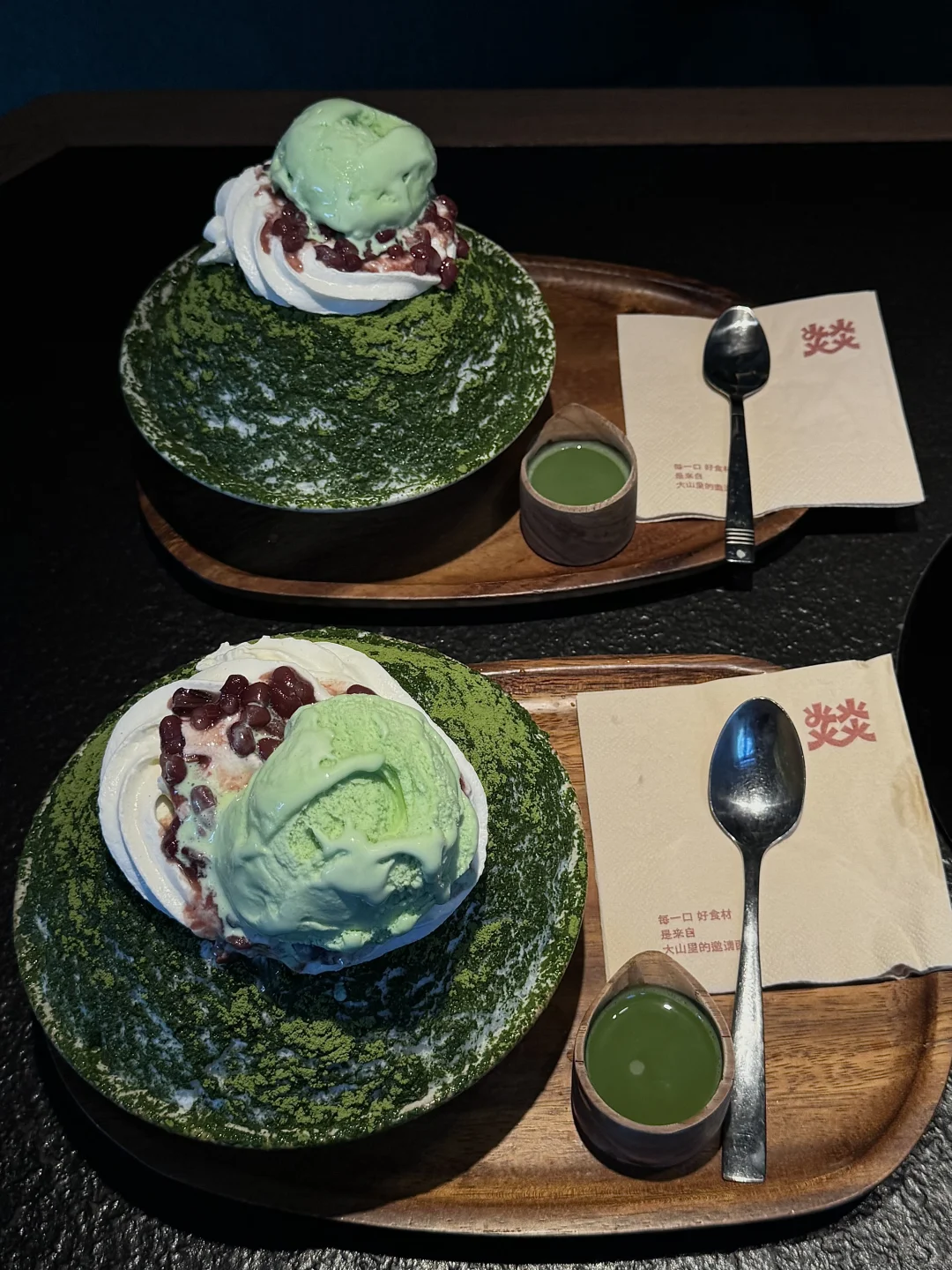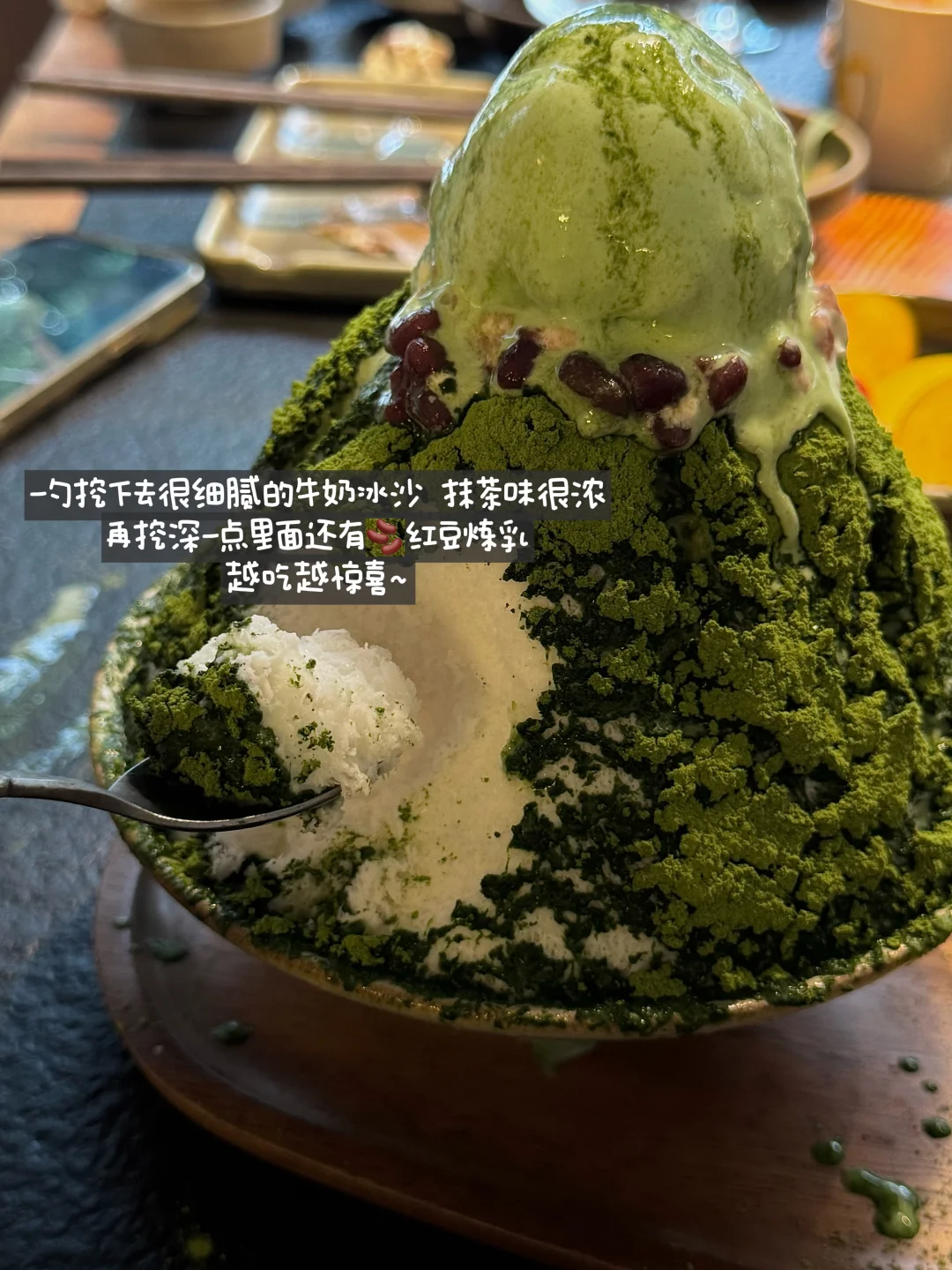 贵州铜仁抹茶冰!!很浓郁的味道!! 外面撒了一层厚厚的微苦抹茶粉 顶上还有一颗抹茶雪糕球 中间夹心是绵密的红豆沙 整体味道不会太甜