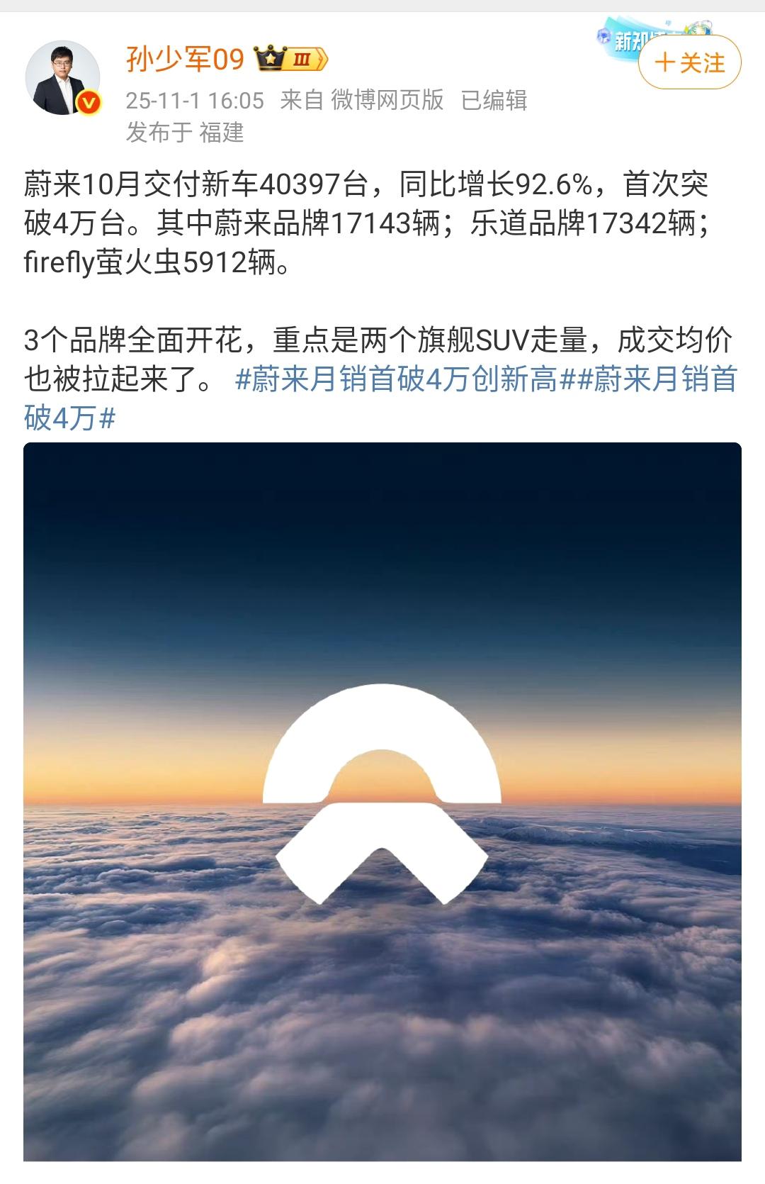 孙少军:蔚来10月交付新车40397台,同比增长92.6%,首次突破4万台。其中蔚来品牌17143辆;乐道品牌17342辆;firefly萤火虫5912辆! 发现一个非常有意思的现象,蔚来品牌的主销车型是价格偏贵的ES8,乐道的两款产品销量都非常的好。 萤火虫这款车十几万元,但是加了租电之后,价格进一步下探竟然也卖出去了将近6000辆。 其实对于蔚来汽车来说,有喜有忧,有喜的是有4款车辆都非常受市场欢迎,忧的是蔚来二代未来产品占比不高,大家还是在等待第3代的产品。 各位是怎么看的?欢迎评论区留言。