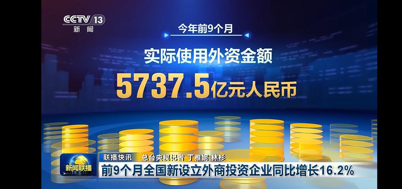 前9个月全国新设立外商投资企业同比增长16.2%,实际使用外资金额5737.5亿元人民币。